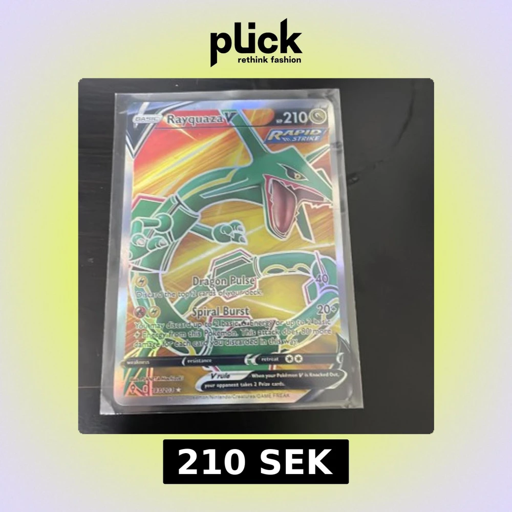 Coolt Rayquaza V Pokémonkort med färgstark design och holografisk yta. Perfekt för samlare och spelare som vill boosta sin lek med en legendarisk drake! Kortet är i skyddsplast och redo för ditt nästa Pokémon-battle.