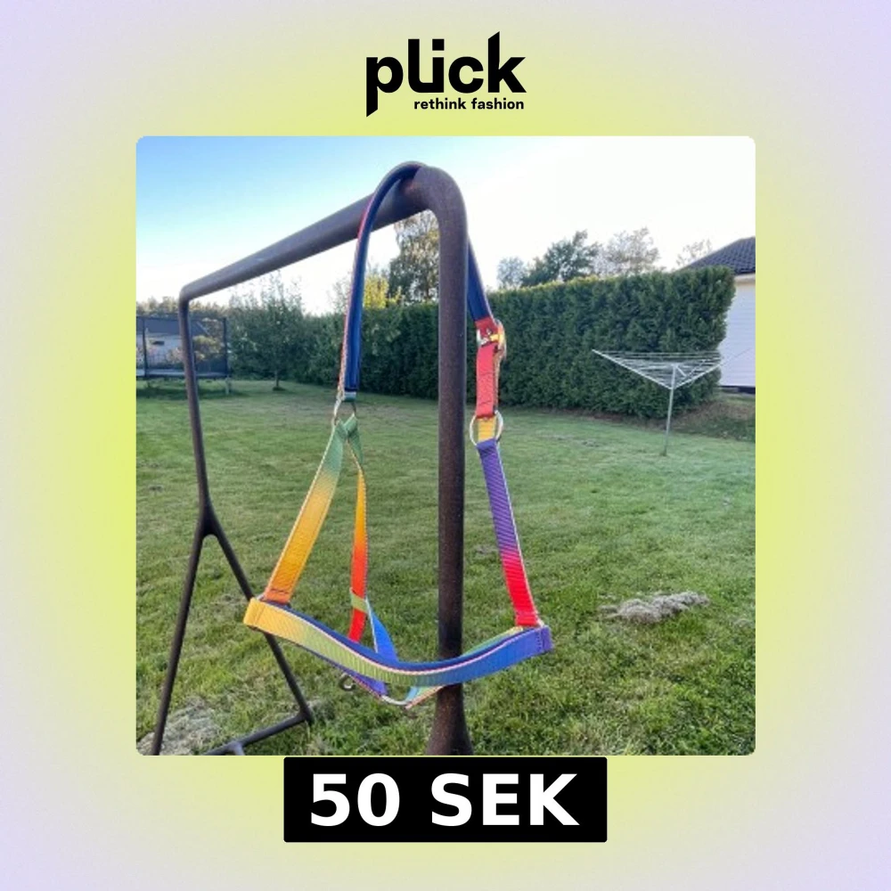 Säljer en färgglad grimma i regnbågens alla färger. Justerbar passform och passar häst i storlek Full.