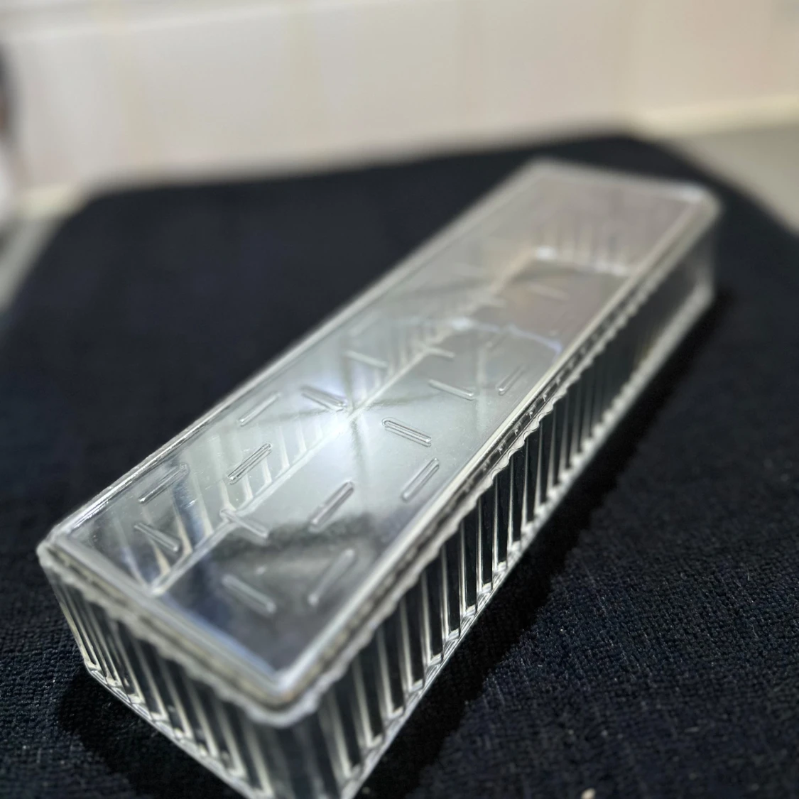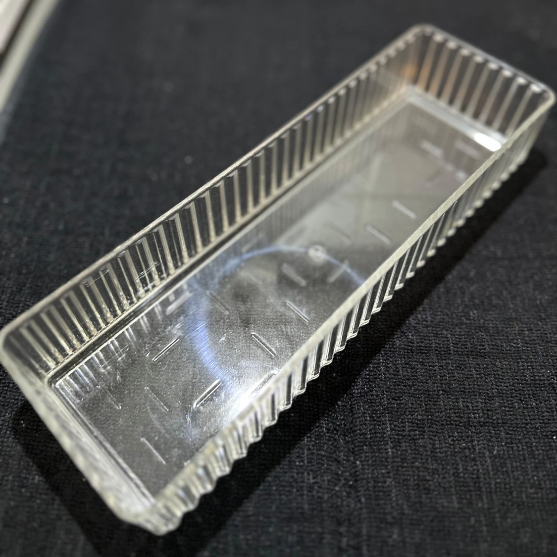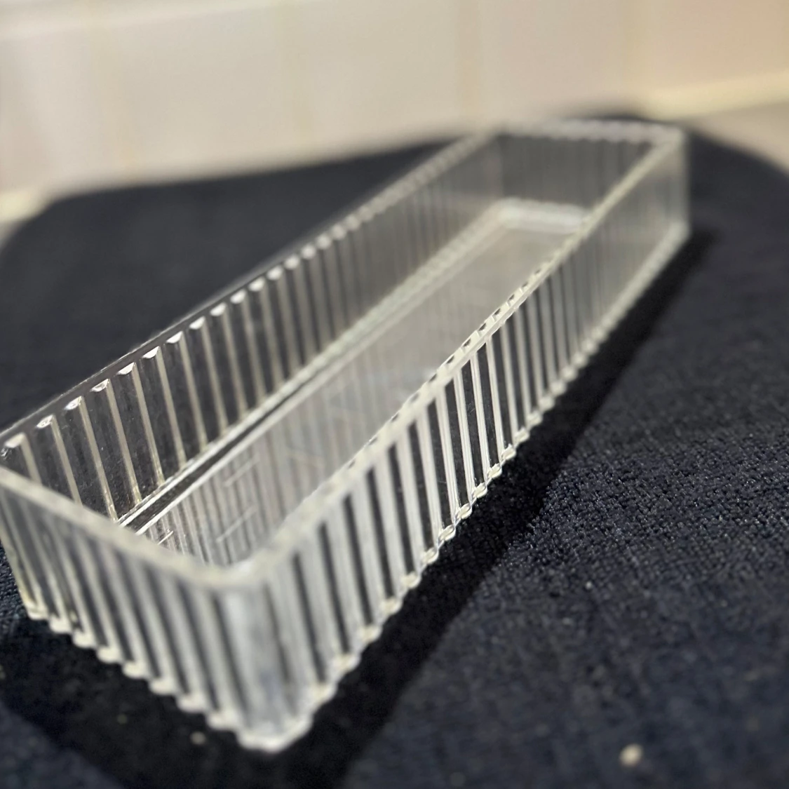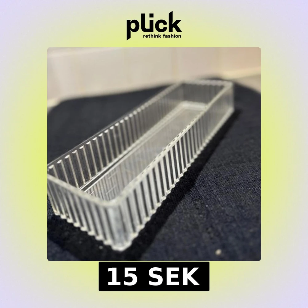 Säljer en stilren och modern plastväsks med rektangulär form och räfflade kanter. Perfekt för dig som vill ha ordning och reda bland smink, smycket eller skönhet.
