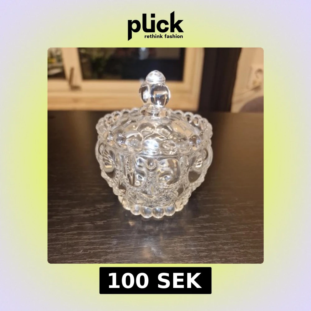 Bilderna visar en gammaldags socker/karamell skål med lock, vackert mönstrad och perfekt för att förvara småsaker eller godis. Den har en unik design med bubblor och detaljer som gör den till ett snyggt inslag i rummet.