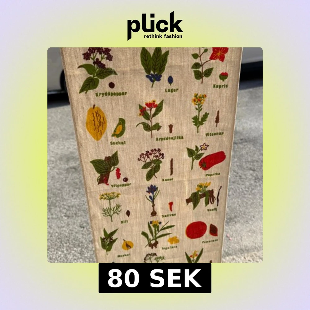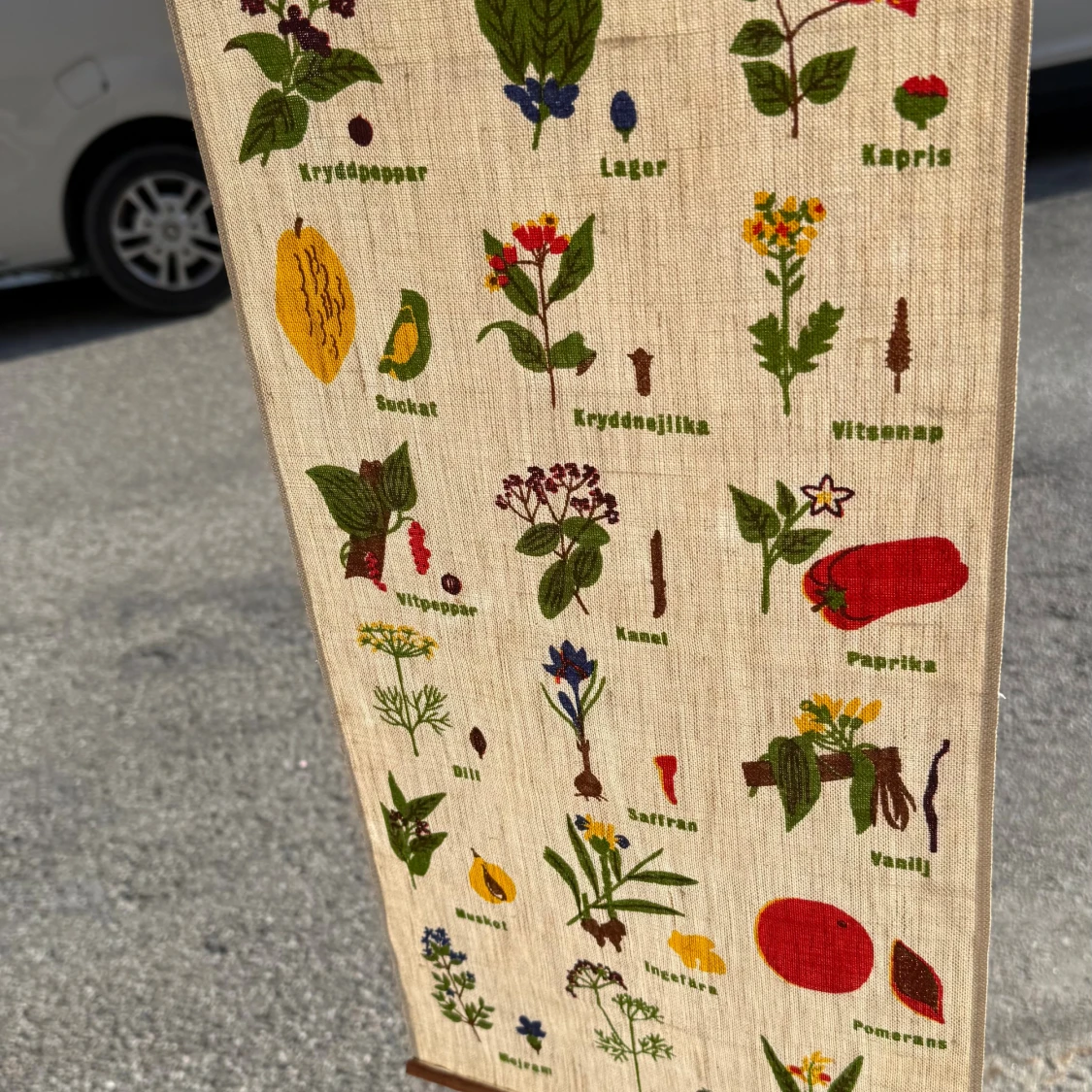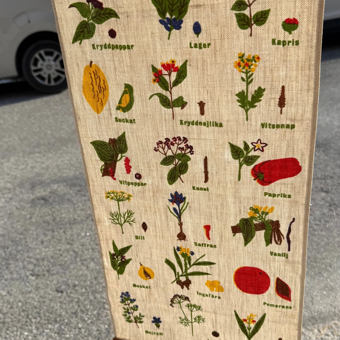 Unik shoppingväska i beige bomull med färgglatt tryck av olika kryddor och växter. Väskan har ett rektangulärt format och mönstret består av illustrationer i grönt, rött, gult och blått. Perfekt för dig som gillar retrostil och vill sticka ut med en cool accessoar.