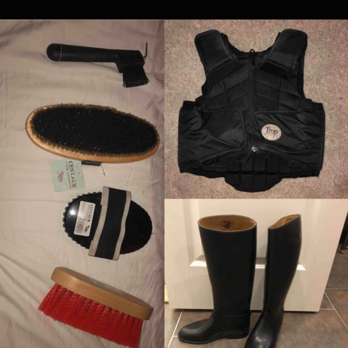 Ridväst: ca storlek s/m, inte använt mycket. (300kr) Ridstövlar: ca 38, gummistövlar, bra märke och bra skick. (200kr) Sett med borstar mm: aldrig använt borstarna, bara hovkratsen (250kr för alla tsm) Snabbaffär kan få bättre pris
