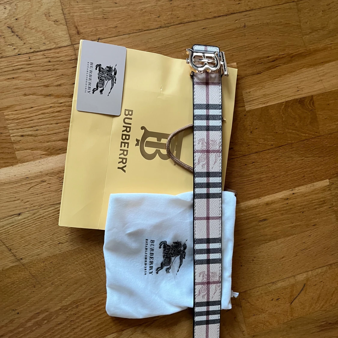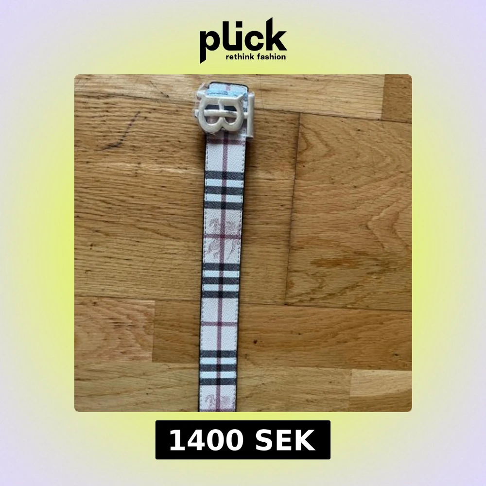 Säljer ett snyggt Burberry bälte med klassiskt rutigt mönster i beige, svart, vit och röd. Bältet har en stilren silverfärgad spänne med Burberrys logga. Materialet är skinn och bältet kommer med originalpåse och Burberry shoppingbag. Man får med en grej som man kan göra hål med i bältet. Bältet är dubbel sidig.