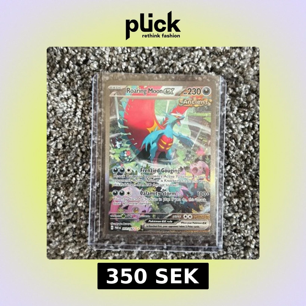 Cool och glittrig Pokémonkort med Roaring Moon ex! Perfekt för samlare och spelare som vill ha en kraftfull och snygg kort i sin samling. Kortet har unika attacker och färgstark design som sticker ut i leken.