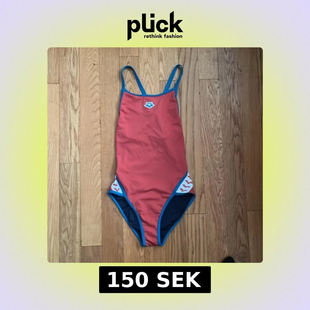 Sportig röd baddräkt från Arena med blå kantband och smala axelband. Baddräkten har öppen rygg och inslag av vitt och blått mönster vid höfterna. Perfekt för simträning eller bad.
