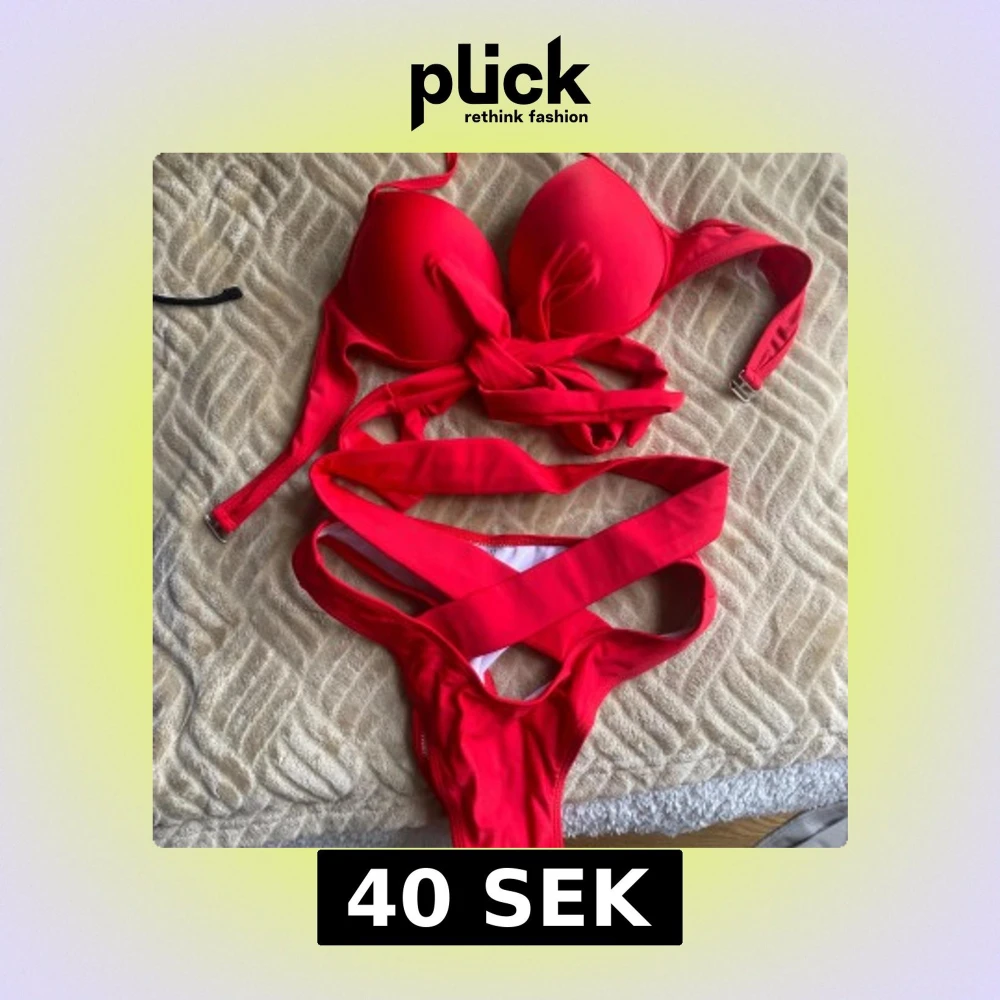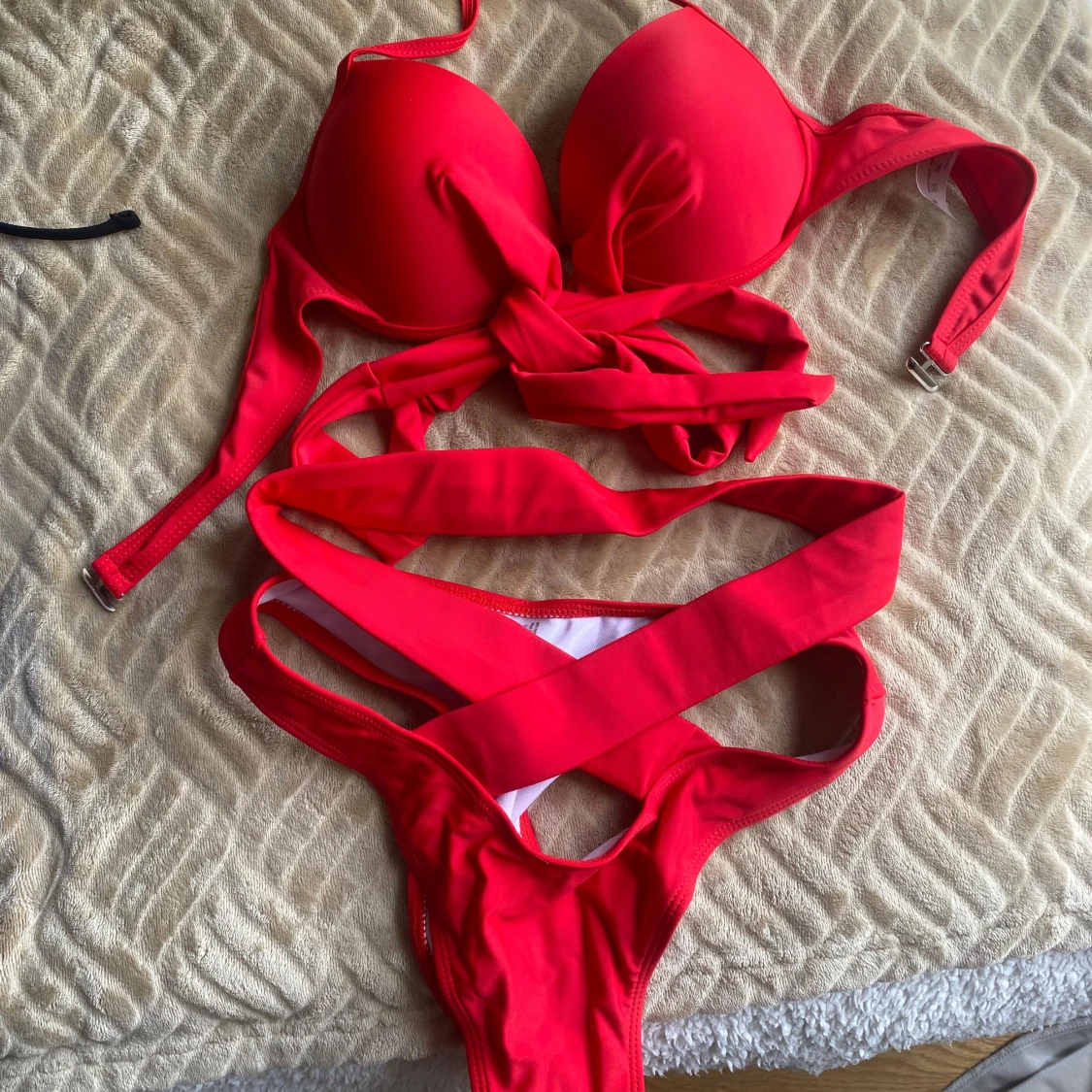 Snygg röd bikini med vadderad topp och breda axelband. Toppen har knyt framtill och underdelen har flera band som korsas över magen för en trendig look. Perfekt för stranden eller poolen. Aldrig använda.