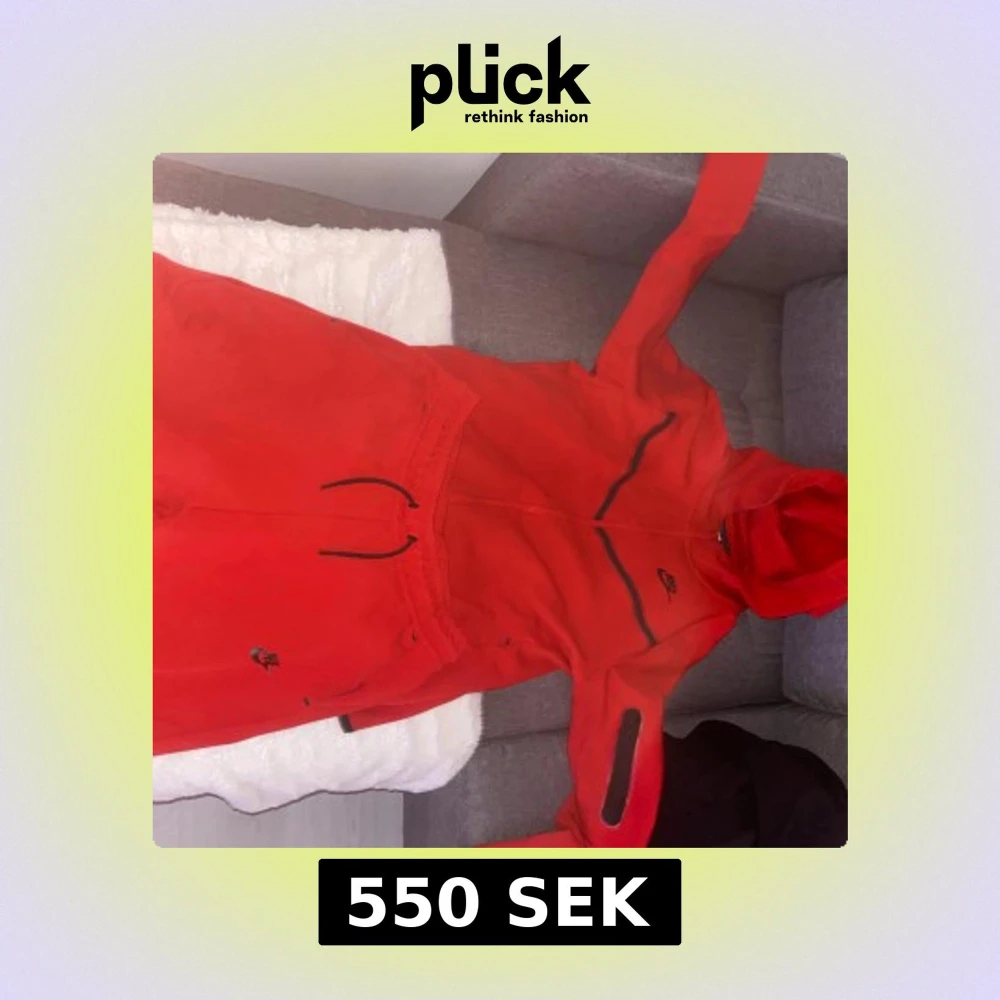 Säljer en röd hoodie från Nike med dragkedja och huva. Den har svarta detaljer och en ficka framtill. Perfekt för en sportig look eller avslappnade dagar.