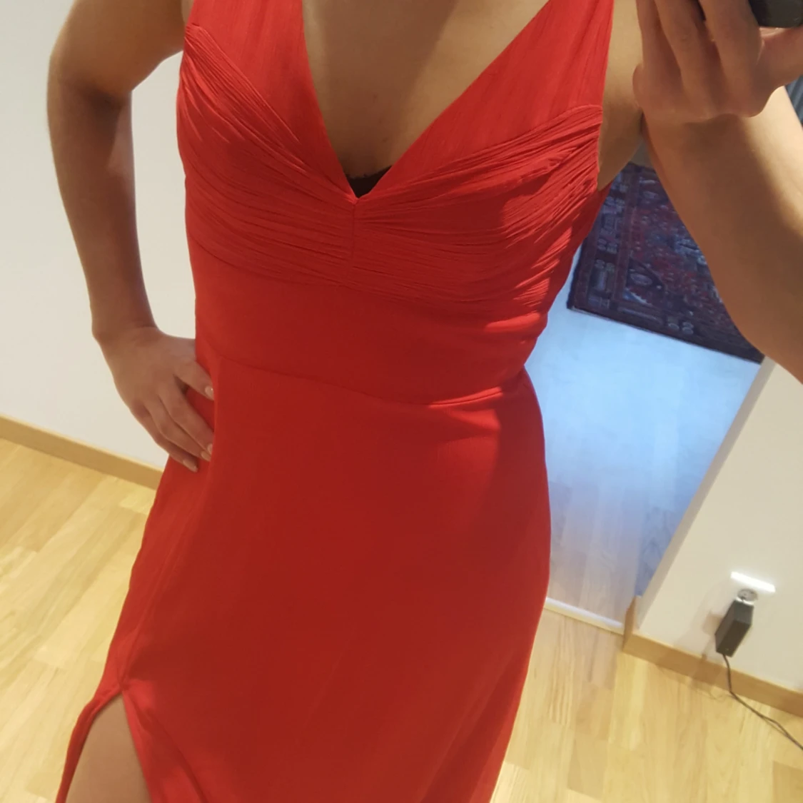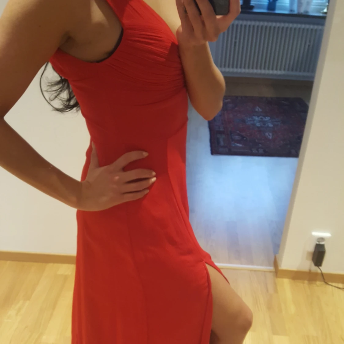 Röd långklänning med slits vid ena benet. Använd endast 1 gång på en bankett. Storlek 34 Finns i Helsingborg och kan skickas mot fraktkostnad.
