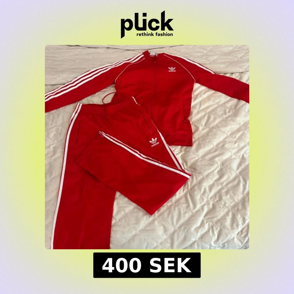 Säljer ett klassiskt rött Adidas mjukisset med vita ränder längs sidorna och broderad logga framtill. Byxorna har resår i midjan med snörning och är perfekta för en sportig look. Byxorna är i en rak modell.