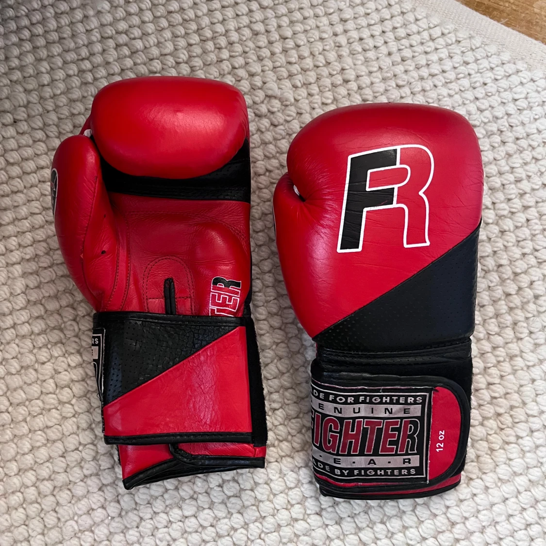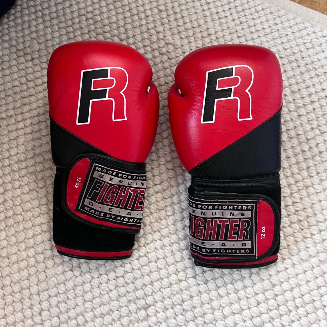 Säljer ett par röda boxningshandskar från Fighter i storlek 12 oz. De är gjorda för fighters och har en cool design med svart och röd färg. Perfekta för träning och sparring. Kardborreband för enkel justering och bra passform. Använda men i bra skick!