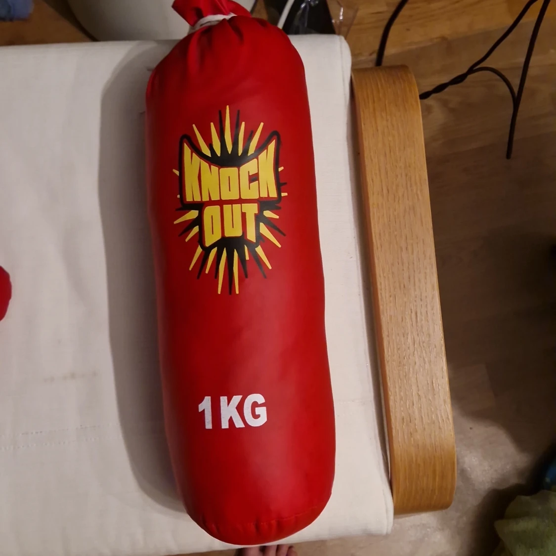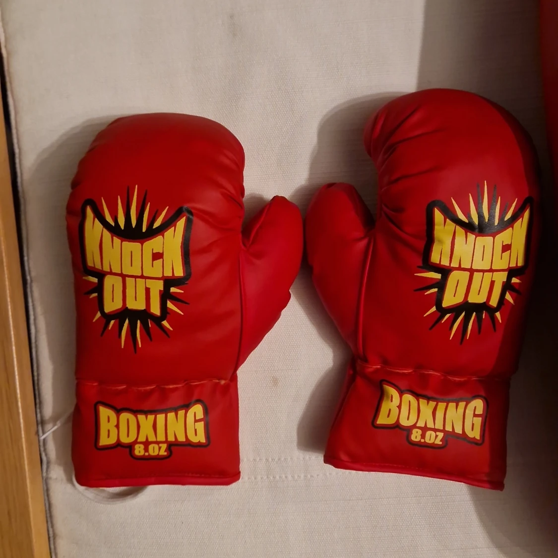 Säljer ett par röda boxningshandskar från Knock Out, 8 oz, med coolt tryck i gult och svart. Perfekta för träning och boxning, tillverkade i syntetmaterial. Snygg design som sticker ut och passar dig som vill köra hårt på gymmet.