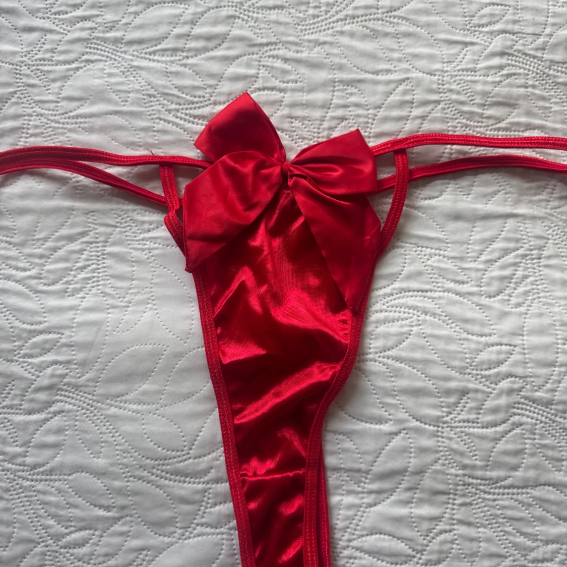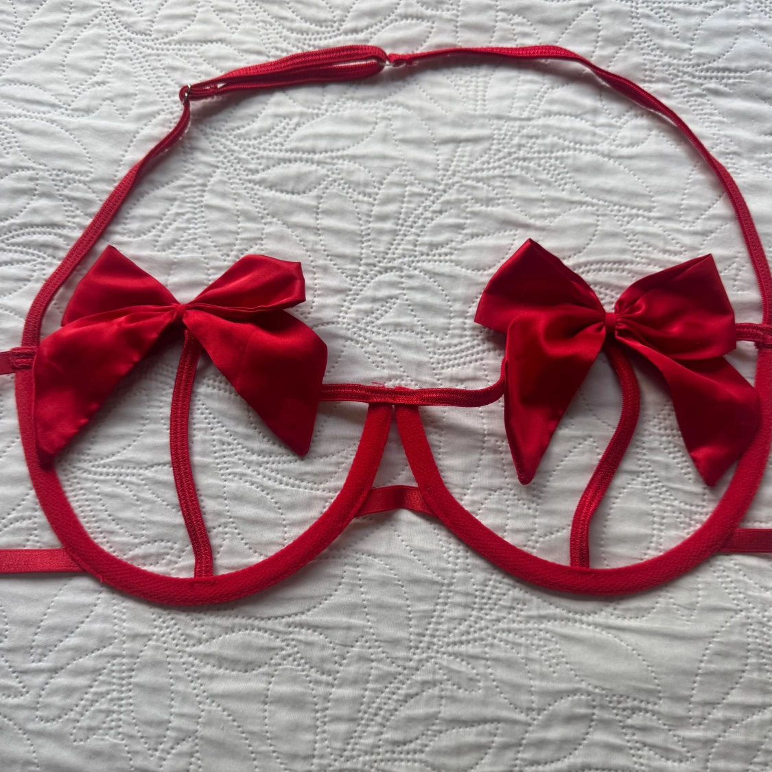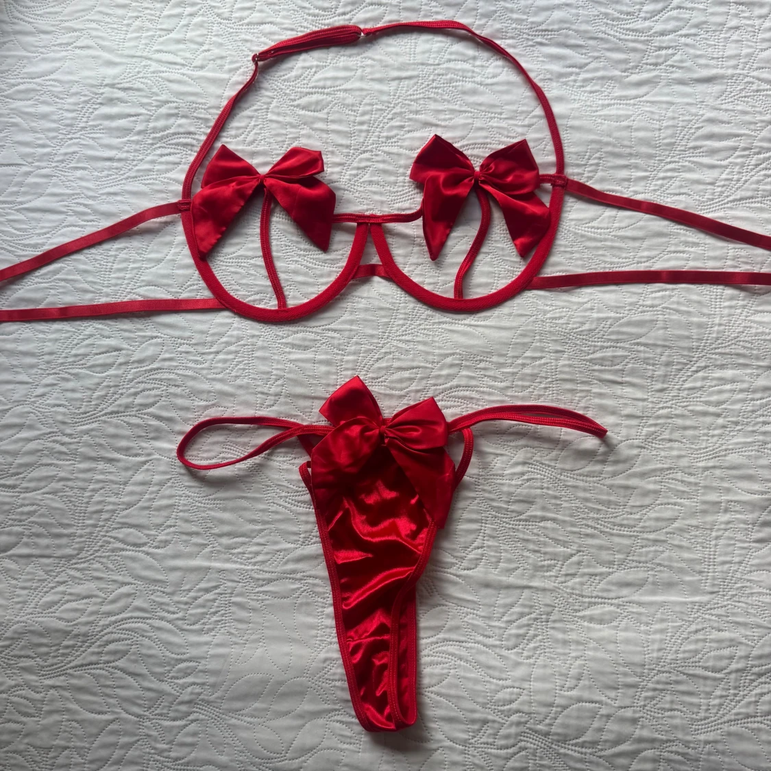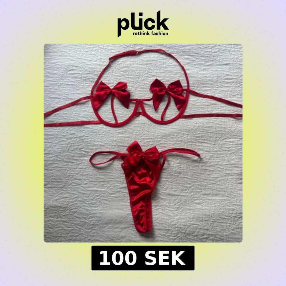 Superfin sexiga underkläder med stora rosetter på både överdel och underdel. Överdelen har öppna kupor med två satinskimrande rosetter och smala band. Underdelen är stringmodell med en matchande rosett framtill. Tillbehör med rött midjeband, hjärtformad detalj och silverfärgade kedjor ingår. Använd en gång/provade. Storlek XL, men förminskad som L.