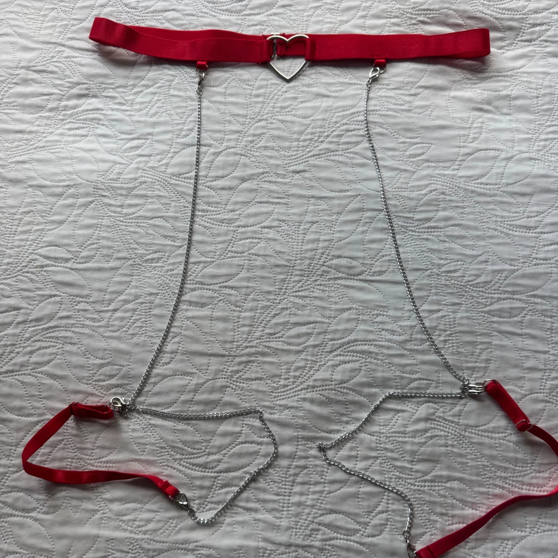 Röda underkläder med rosetter och kedjedetaljer