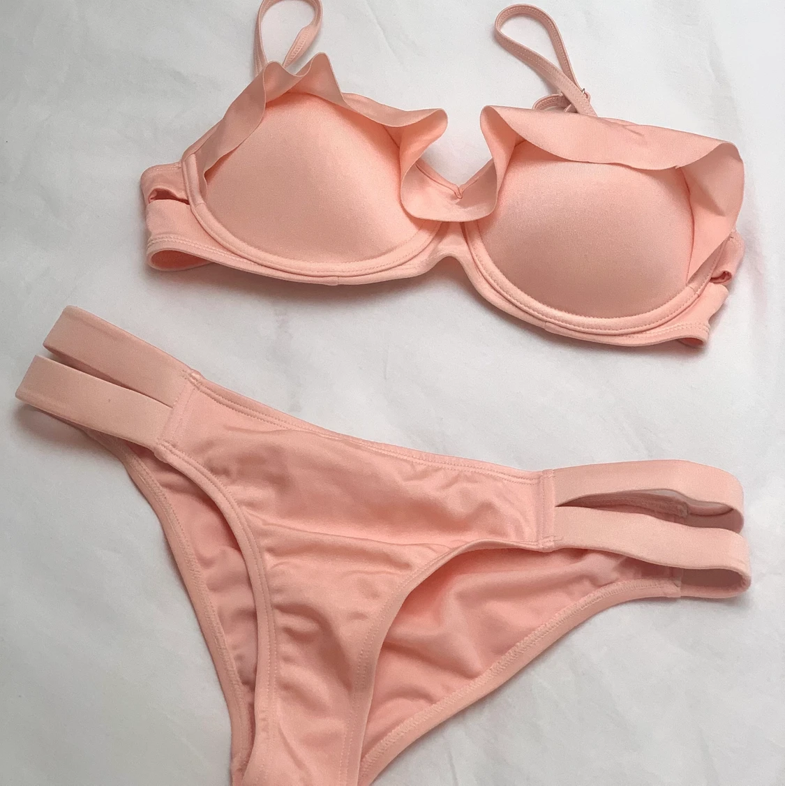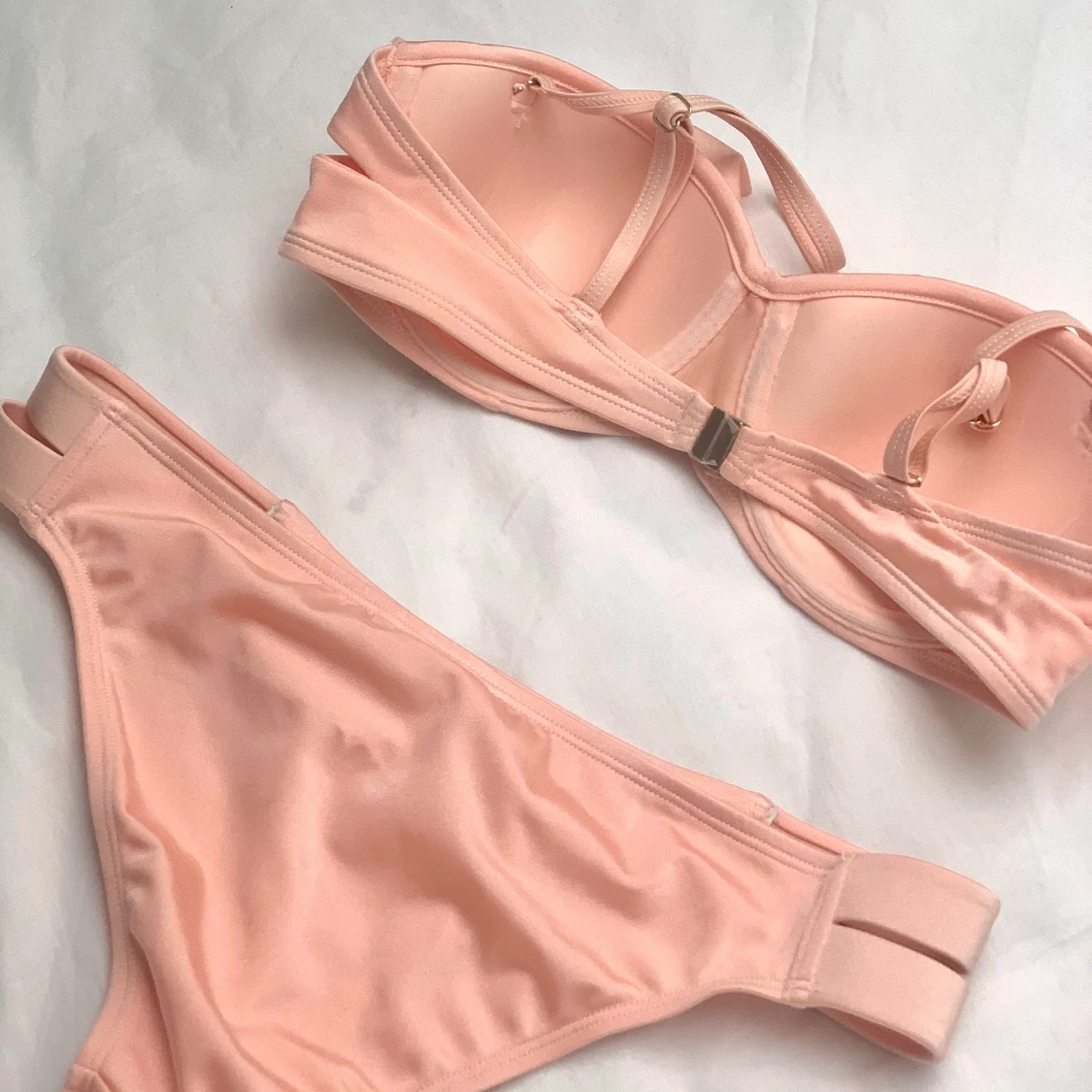 Säljer ej separat! Rosa bikini, topp är balkongbh med söt detalj och underdel har ”cut outs” vid höften. Både underdel och överdel är UK10 (38). Skulle dock vilja påstå att dessa är 36-38, passar beroende på storlek på byst.