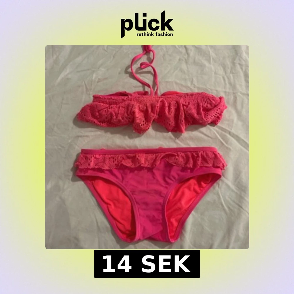 Söt rosa bikini med volang och spetsdetaljer på både överdel och underdel. Överdelen har knyt i nacken och spänne i ryggen. Materialet är syntet och färgen är starkt rosa. Perfekt för strand eller poolhäng! Lite solblekt.