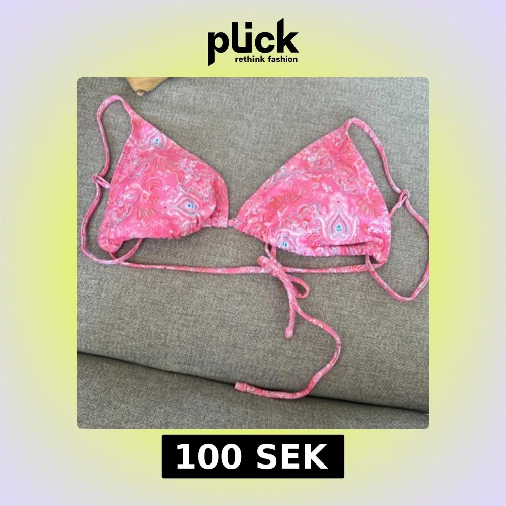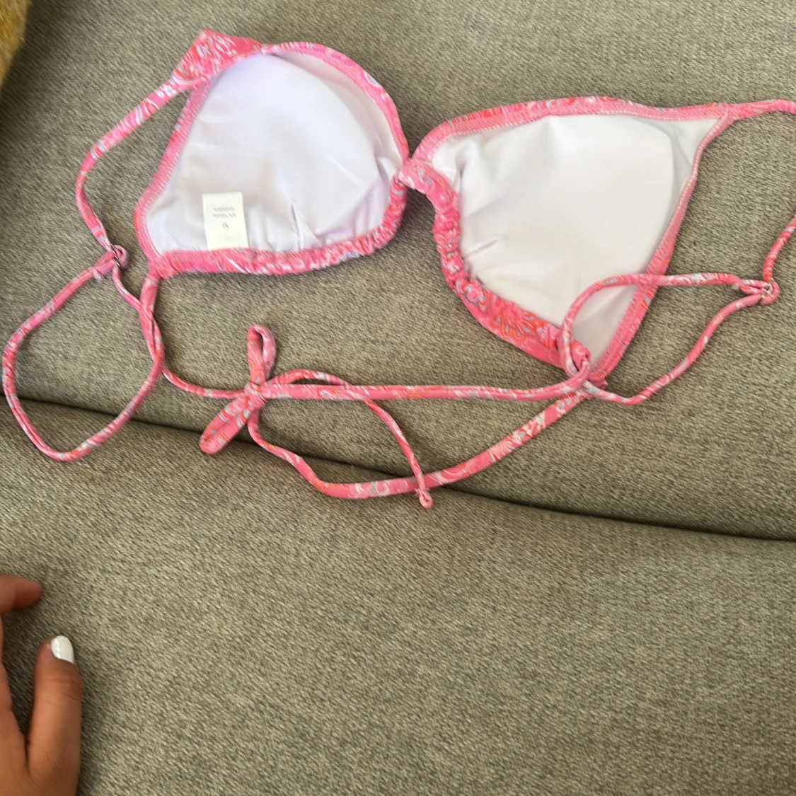 Snygg trekantsbikini i rosa med paisleyinspirerat mönster i vitt, blått och rosa. Perfekt för stranden eller poolen, ger en färgglad och trendig look. Den är helt oanvänd för att jag råka köpa för storlek. Den är i storlek 80 A/B. I och med att den går att knyta åt passar den nog även de som har 75 A/B.