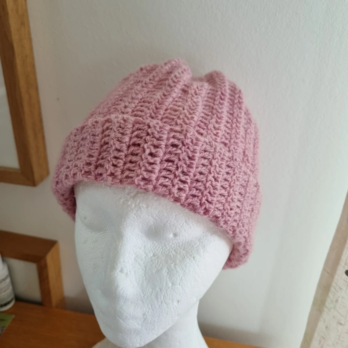 En virkad rosa mössa som jag gjort själv. Den är lagom varm, inte för kall on ikte för varm.