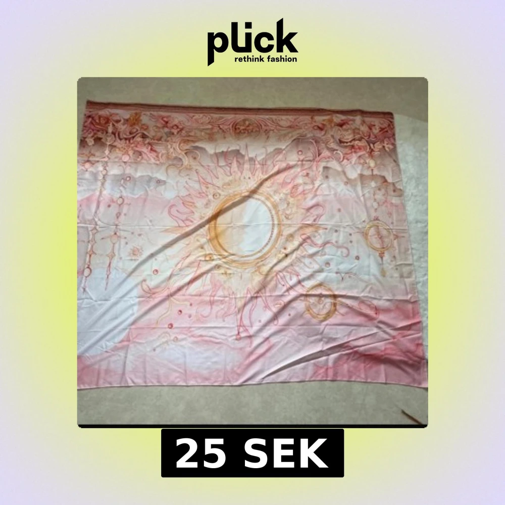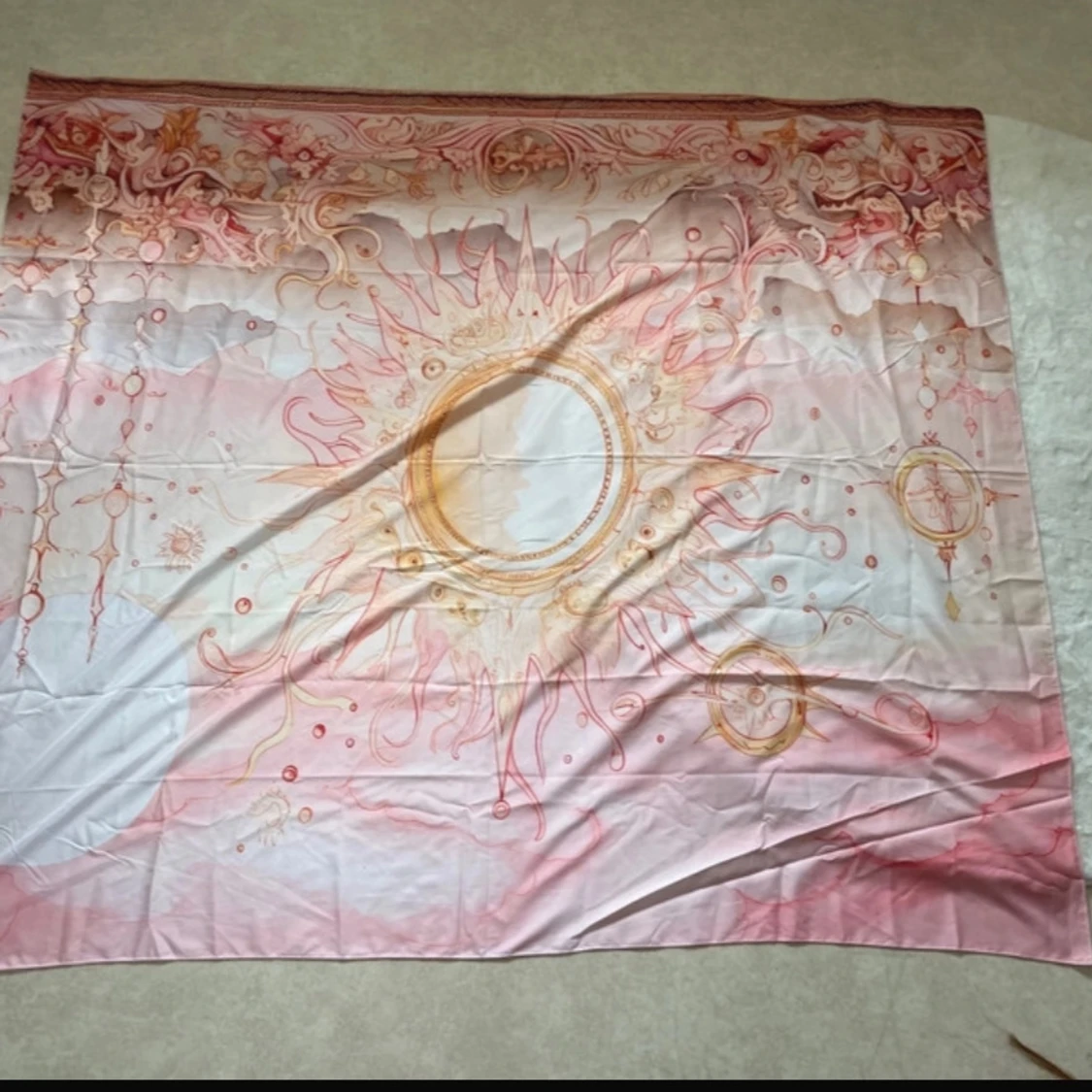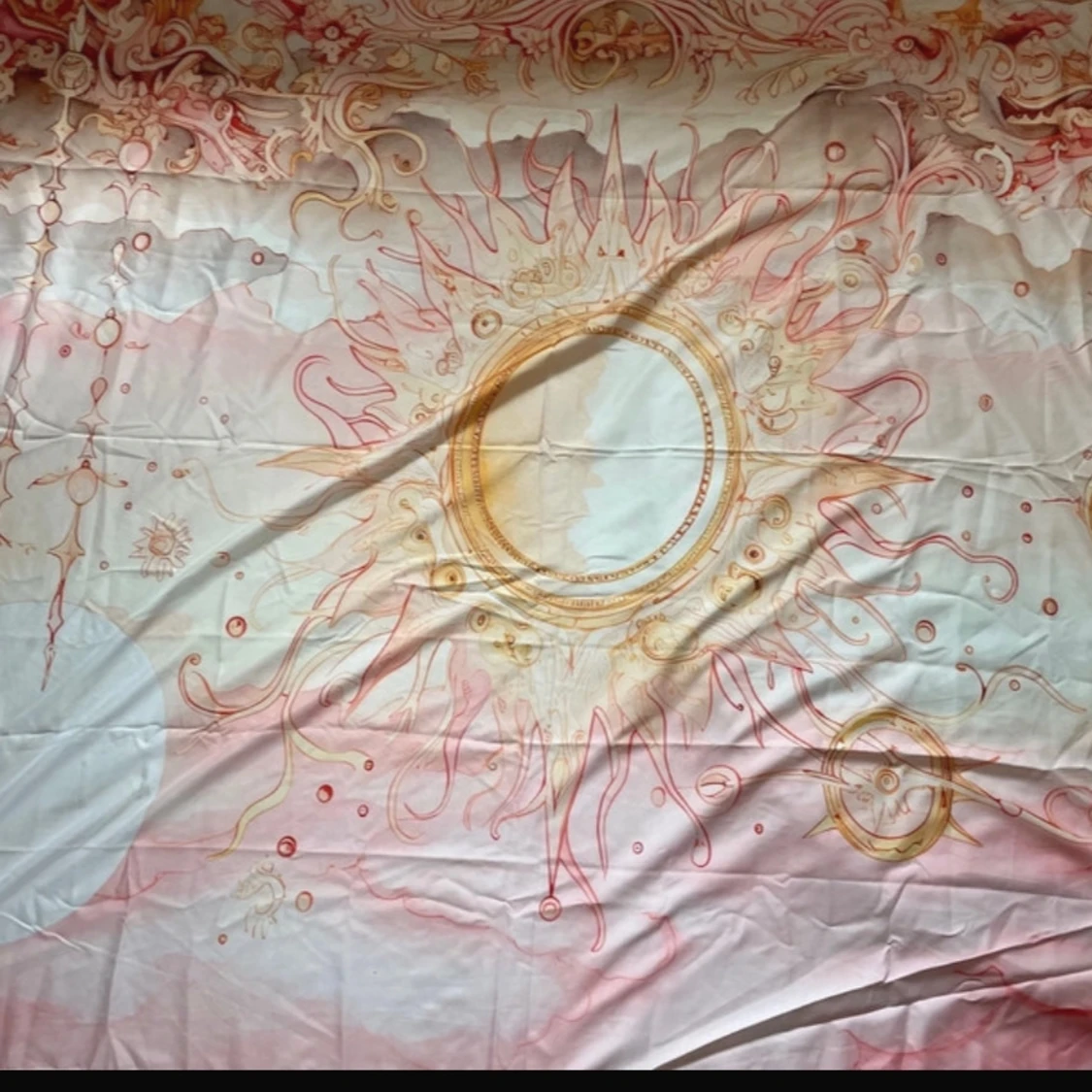 Stor, fyrkantig väggbonad i silkesliknande material med ett detaljerat solmönster i guld och rosa toner. Färgerna skiftar från ljusrosa till mörkare rosa och guld, med konstnärliga detaljer och mjuka övergångar. Använd på väggen en vecka nu ligger den i en påse så kan finns två små hål där man har haft spik annars fint skick