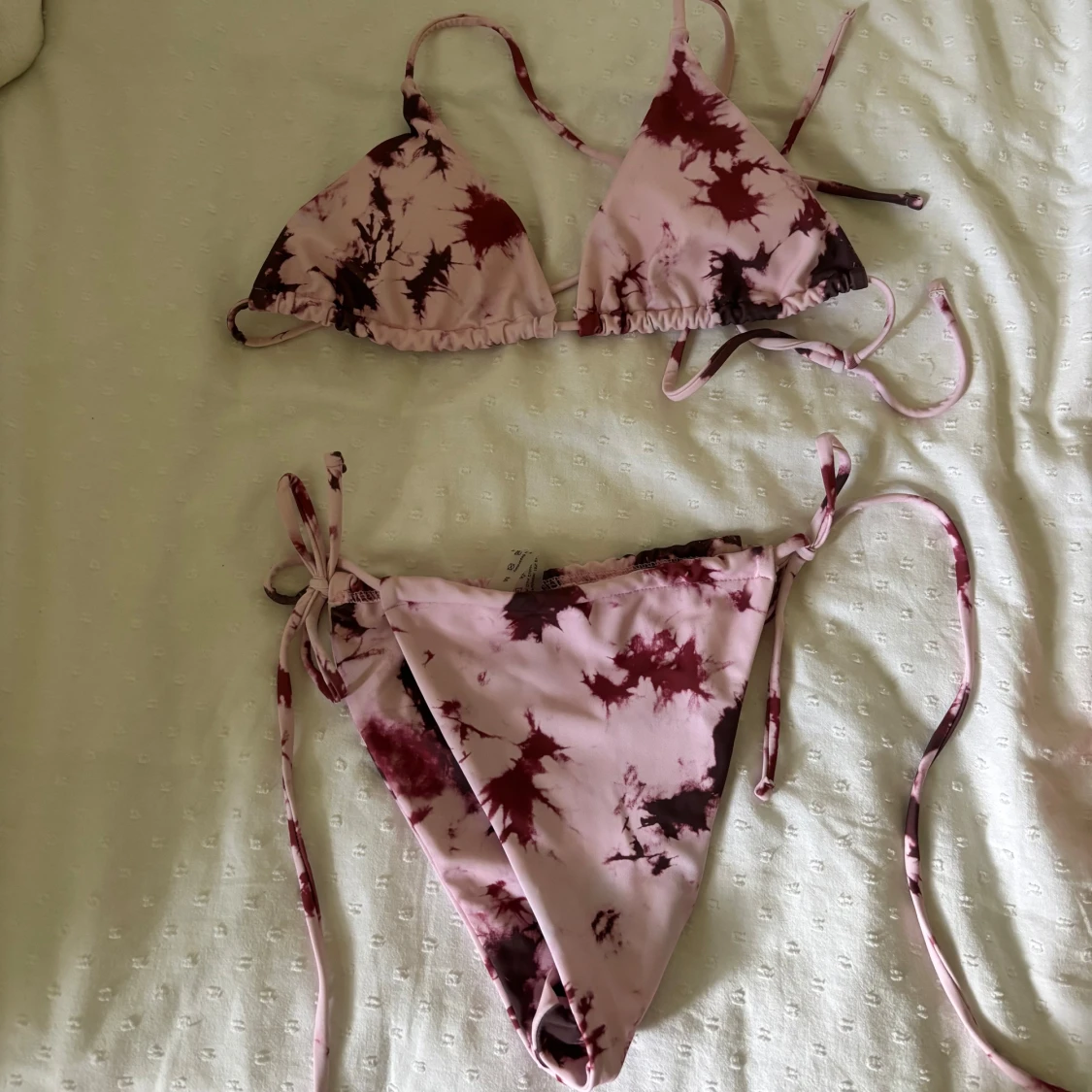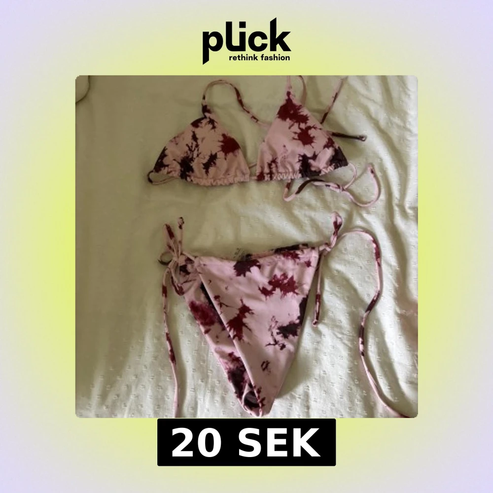 Säljer en snygg bikini med rosa och vinröda batikmönster. Överdelen har trekantsform och knyt i ryggen och nacken, medan underdelen har knyt i sidorna. Perfekt för stranden eller poolen i sommar. Materialet är mjukt och följsamt syntet.