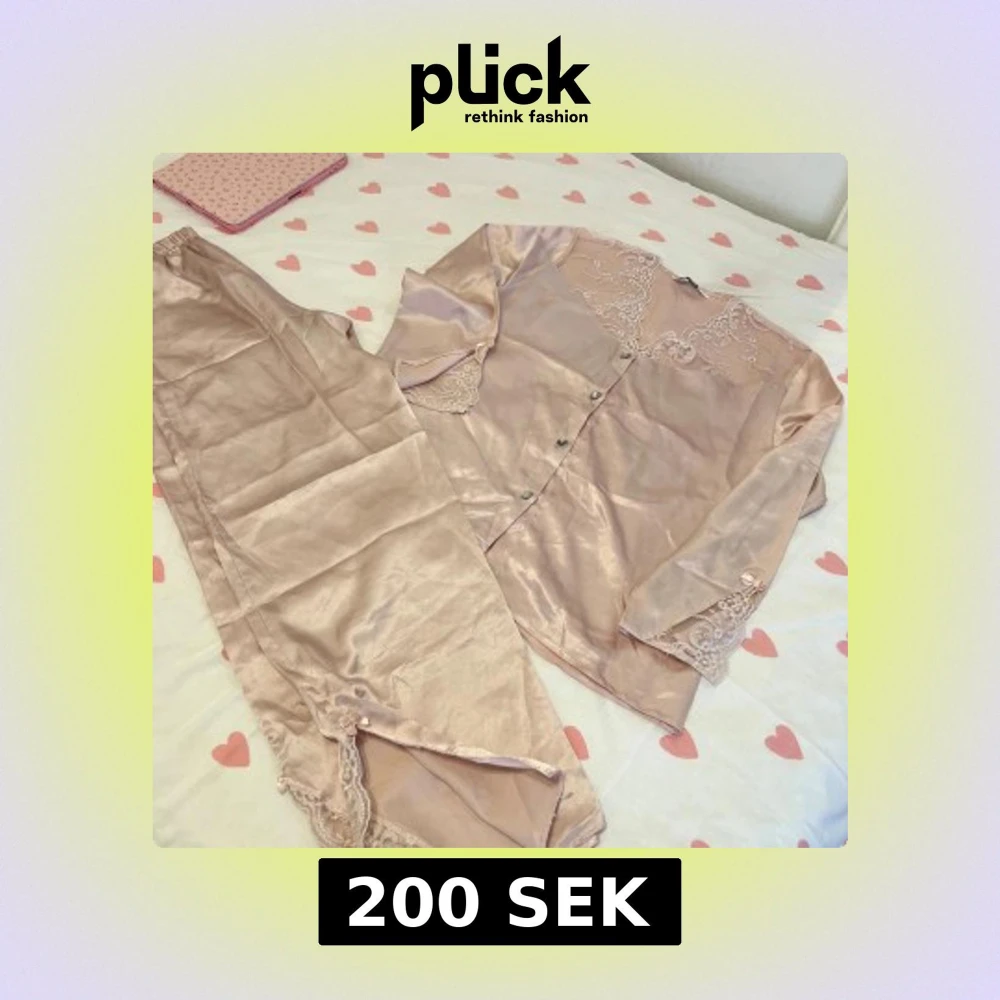 Lyxig satin pyjamas i puderrosa med fina spets slits i ärmen och fotleden. Helt ny, knappast använd. Liten i storleken , passar nog xs-m.