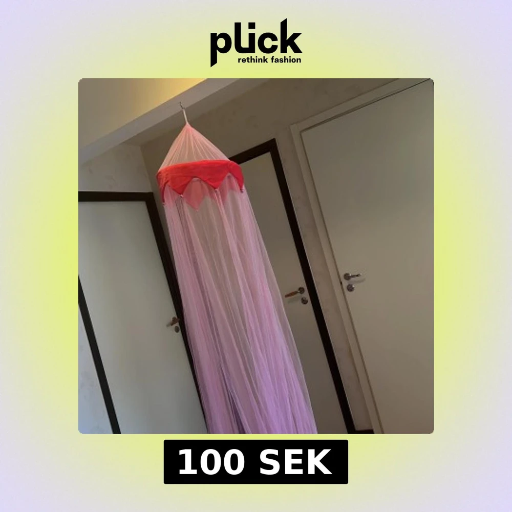 Säljer ett sänghimmel som ser ut som en prinsesskrona i rosa tyll som hänger ner. har en mjuk krona i sammetsliknande material och små pärlor som dekoration. Perfekt för ett barn som älskar prinsessor