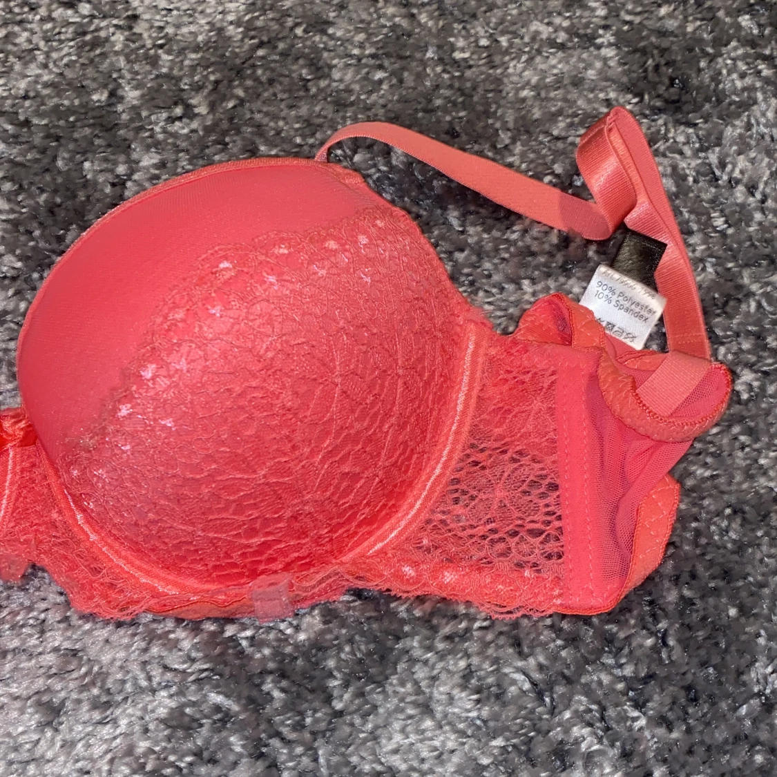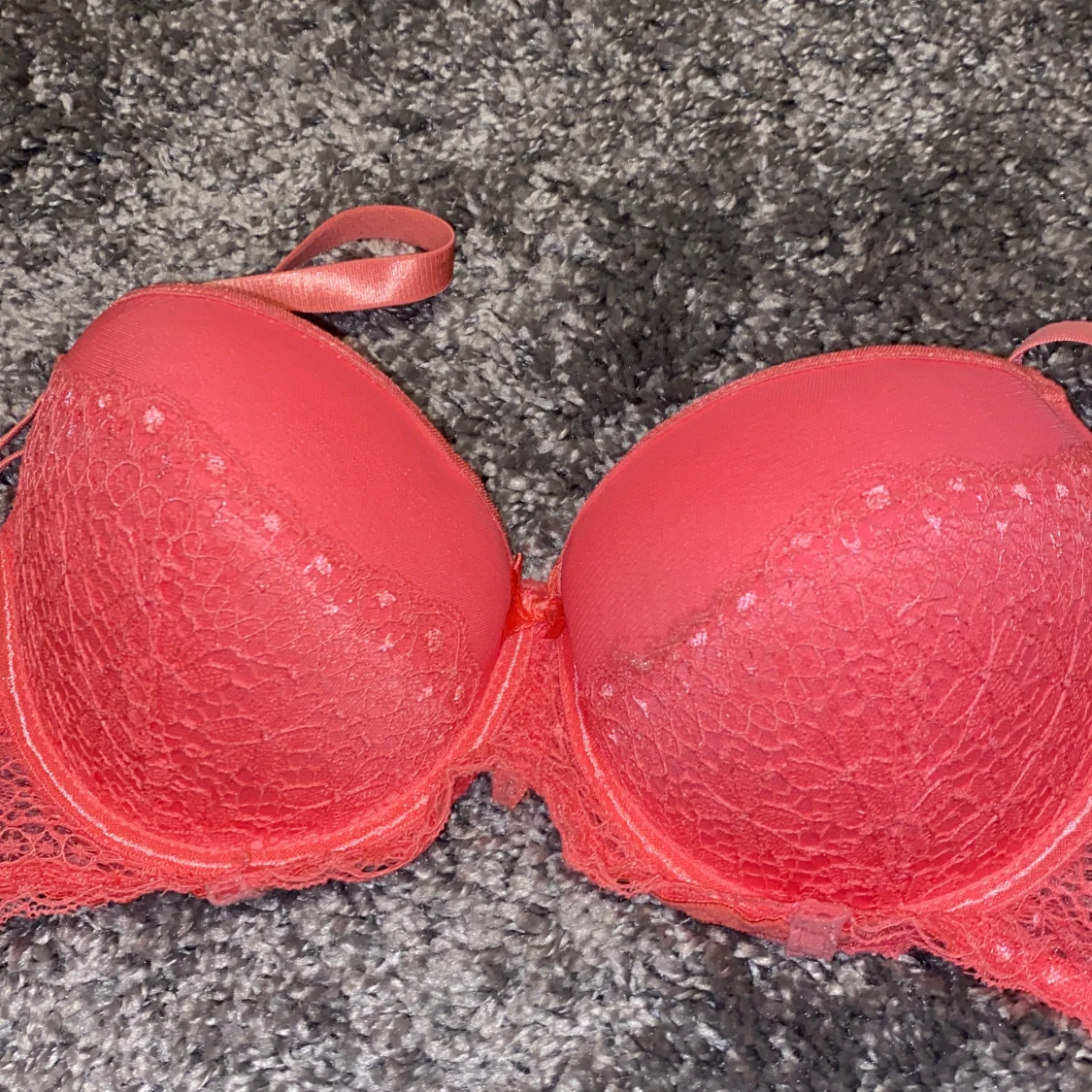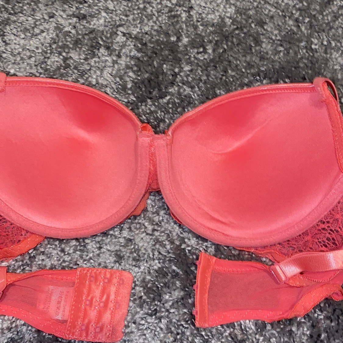 En super söt rosa bh med halv spets på. En rosa rosett mellan bysten. Inte push up men skulle ändå säga ett litet tryck upp ger den ändå.