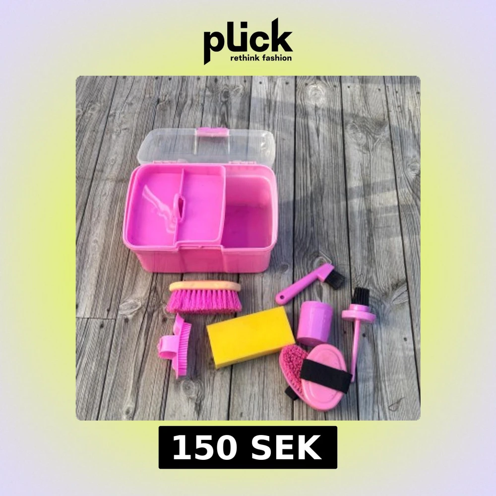 Detta är ett komplett rosa hästskötselkit med borstar, svamp, ryktlåda och tillbehör. Perfekt för daglig hästvård. Lådan har praktiskt handtag och fack för enkel förvaring. Snygg och funktionell för stall eller tävling. Allt på bilderna ingår