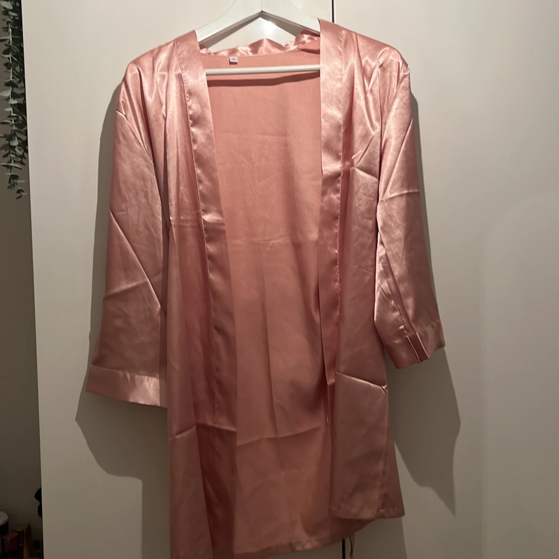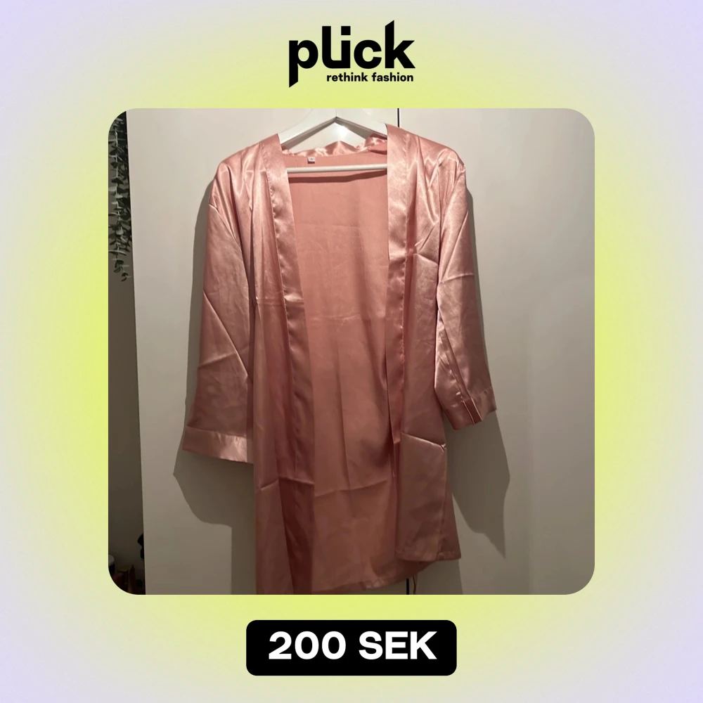 Elegant rosa kimono i siden med trekvartsärm. Perfekt för en lyxig känsla hemma eller som ett stilrent lager över en outfit. Den har en mjuk och glansig yta som ger en exklusiv look. Vet inte märket då jag fick den för längesedan