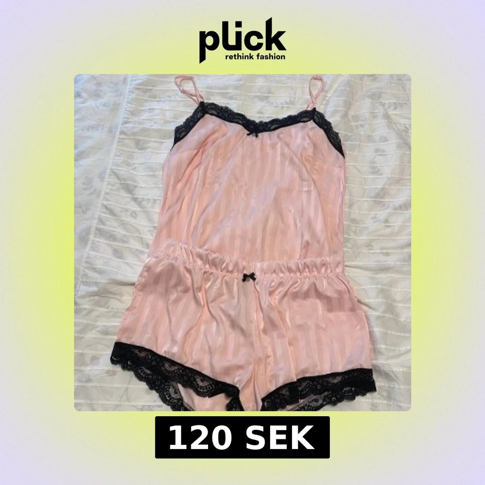 Säljer ett par shorts och linne pyjamas set med rosa ränder och svart spetsdesign