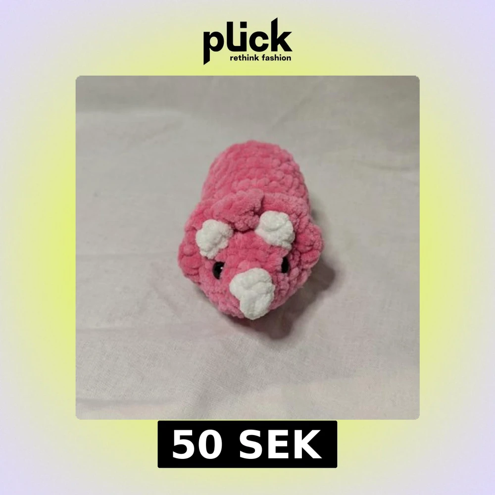 Söt rosa triceratops med vita detaljer och svarta ögon. Perfekt som en mjuk och gosig kompis.