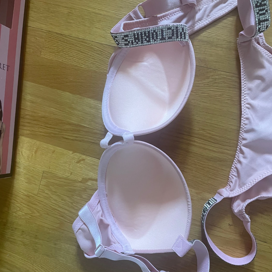 Supersöt ljusrosa underkläder från Victoria's Secret med vadderad bygel-bh och matchande trosa. Axelbanden har glittriga detaljer med text och ger en extra lyxig känsla. Låda följer med är helt ny inte ens provat fick i present. Bh är stl 85b och trosorna passar s/m dom är stretchiga.