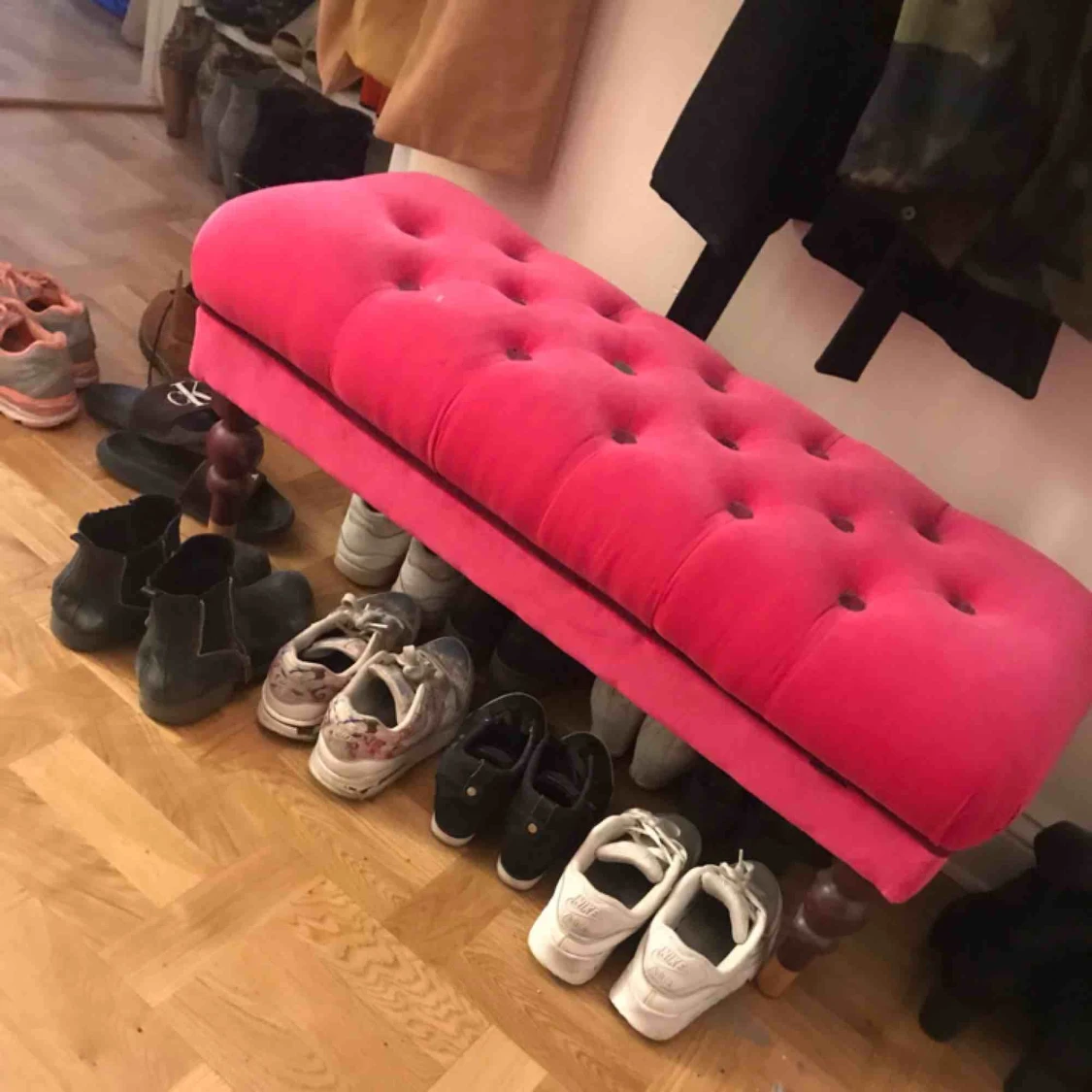 Knallrosa sammets bänk. Finns i Vasastan, Stockholm.
