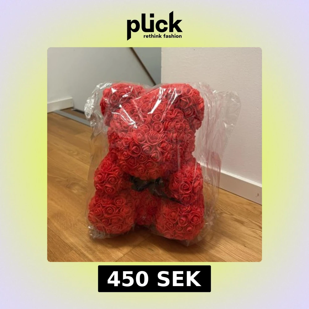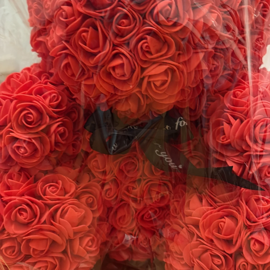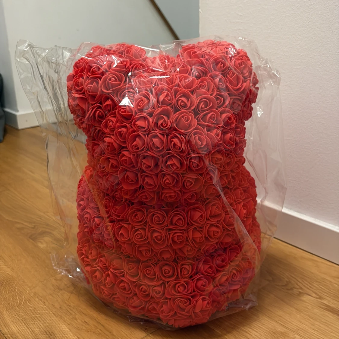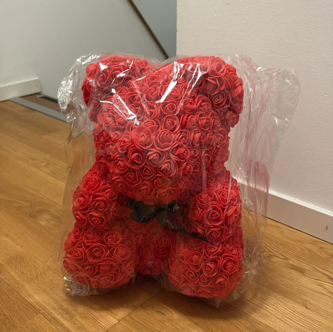 Bilderna visar en nallebjörn gjord av röda konstrosor, inslagen i plast. Det är ingen bok på bilderna, utan en dekorativ prydnad som passar perfekt som present eller inredningsdetalj.