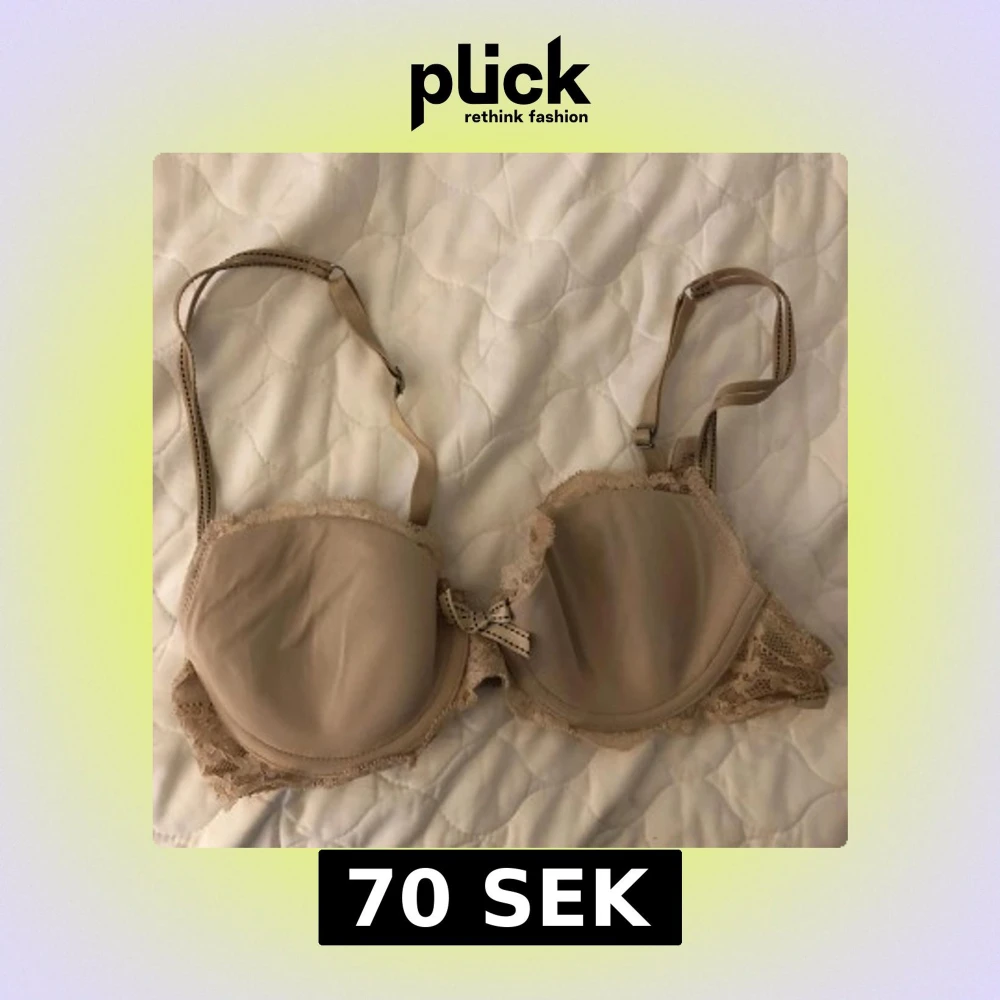 Elegant beige/puderrosa bh från Chantelle med spetsdetaljer och en söt rosett framtill. Justerbara axelband och hakknäppning bak. Uppskattningsvis strl 70B.