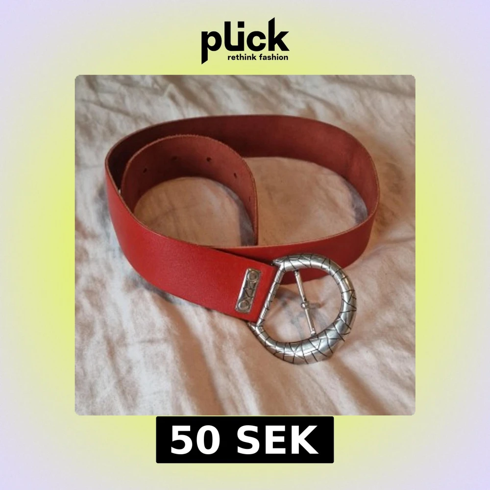 Säljer ett snyggt rött bälte med en bred rem och ett rundat silverspänne med grafiskt mönster. Bältet har flera hål för justering.ca 95 cm långt från ena sidan till den andra och 84 cm från spännet till mittenhålet.