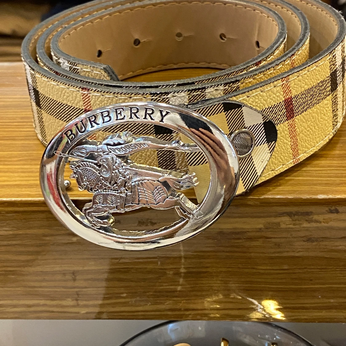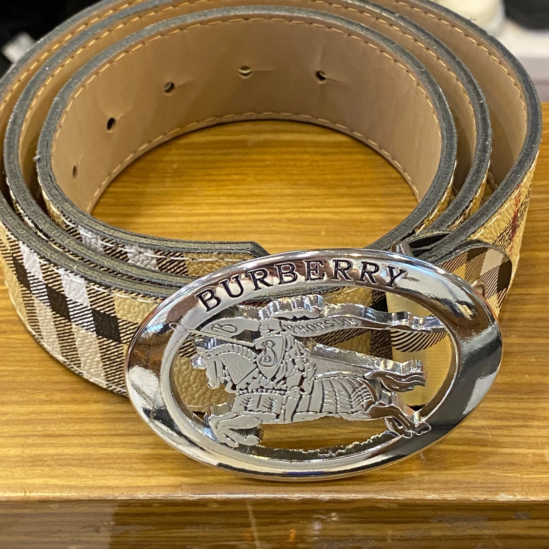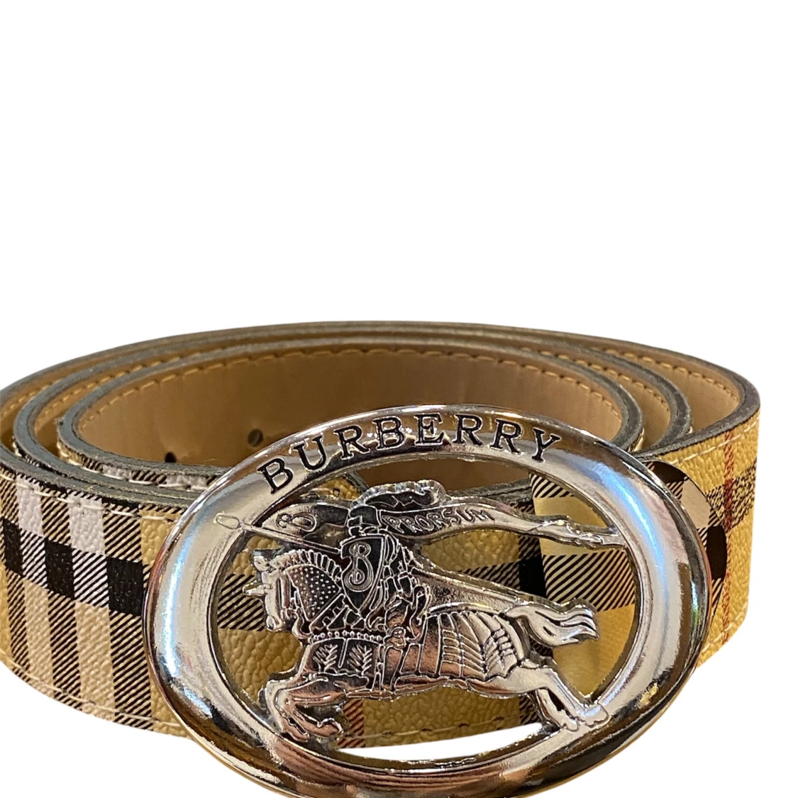 Snyggt bälte med klassiskt rutigt mönster i beige, svart och brunt. Bältet har ett stort, ovalt spänne i silver riddarmotiv. Tillverkat i skinn och perfekt för att lyfta vilken outfit som helst.