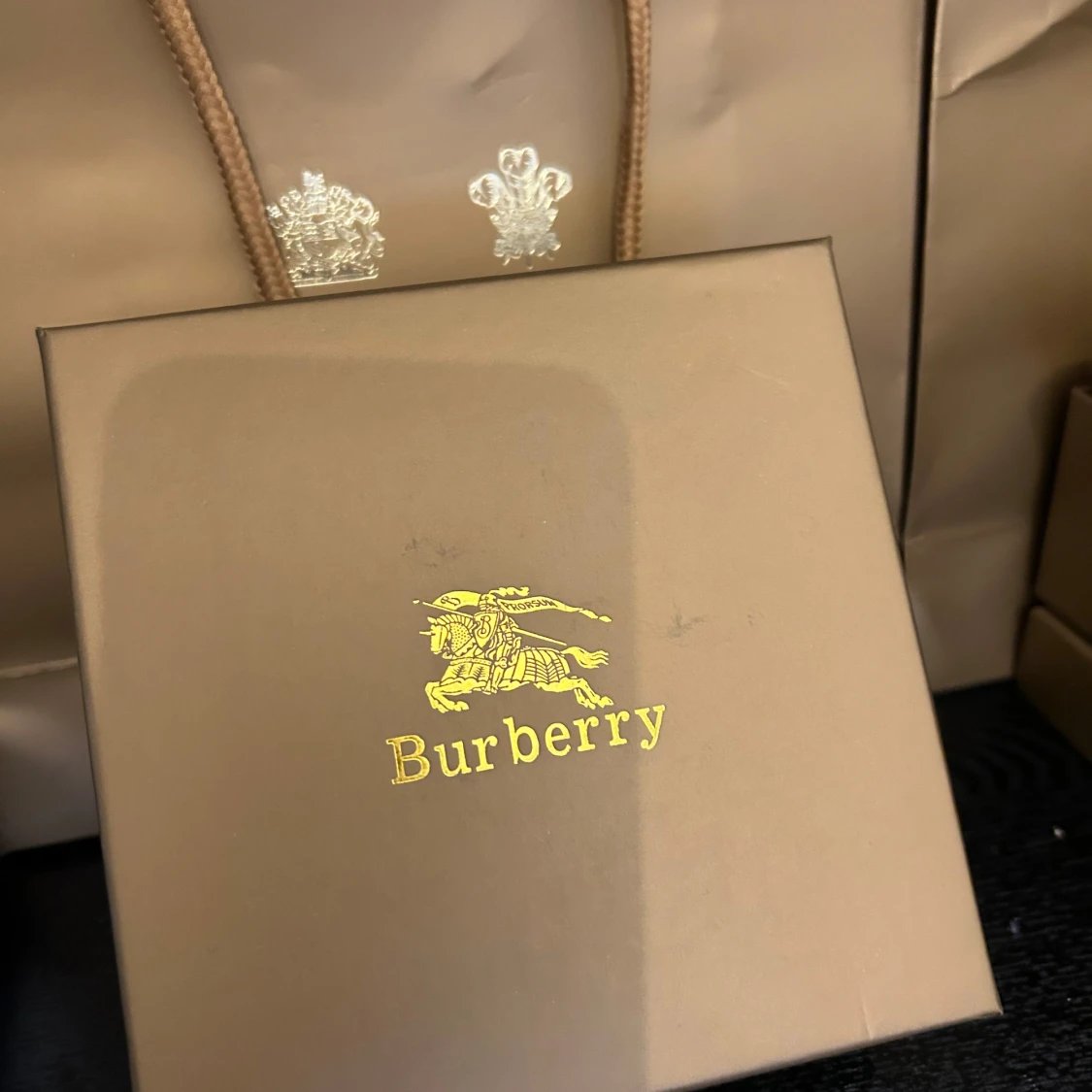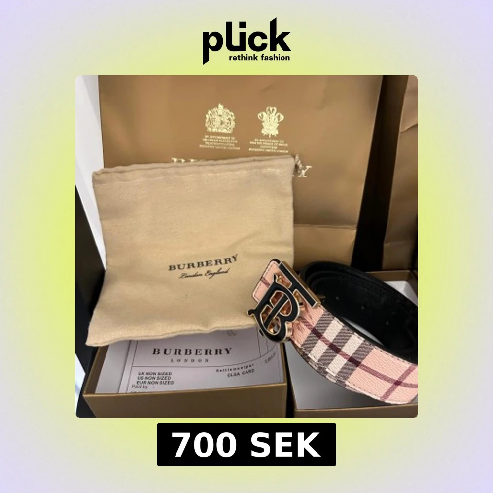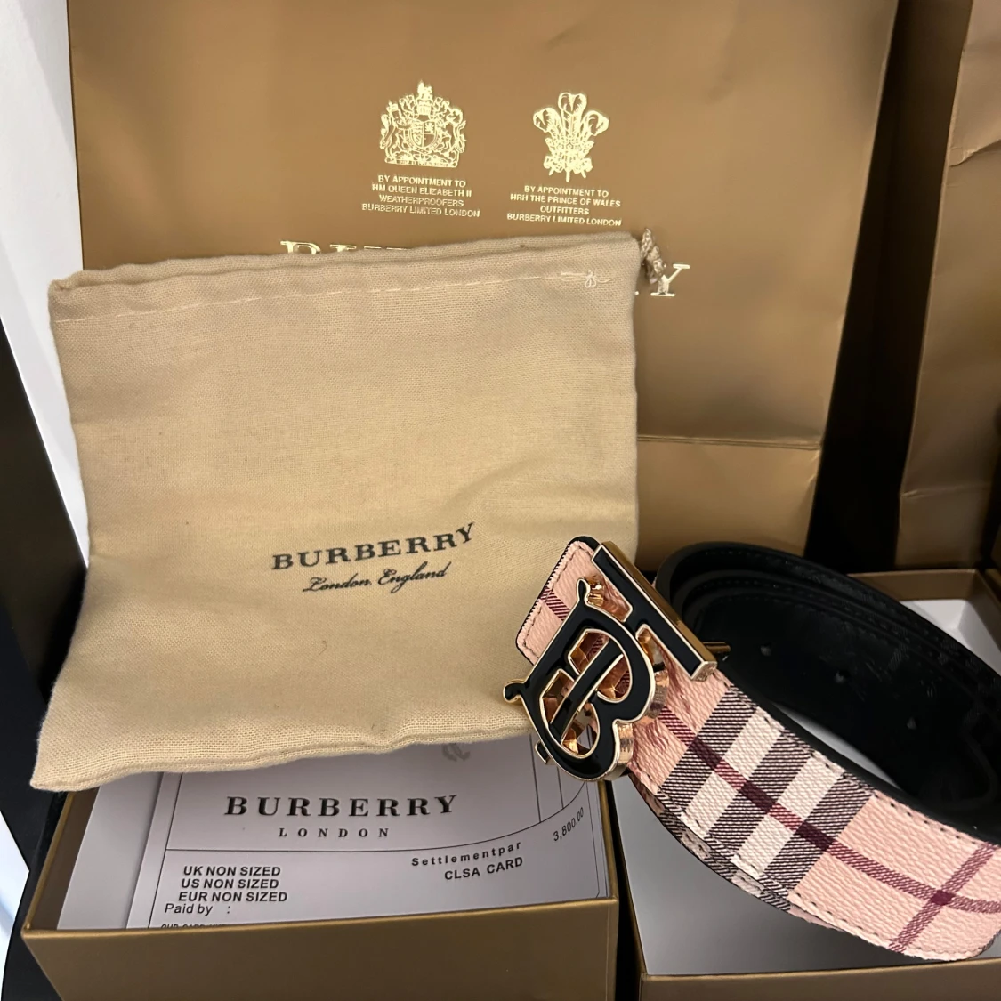 Snyggt Burberry bälte i klassiskt rutigt mönster med rosa, beige och bruna toner. Bältet har ett stort B-spänne i svart och guld som ger en lyxig känsla. Tillverkat i skinn och levereras med originalpåse och box. Perfekt accessoar för att lyfta din outfit.