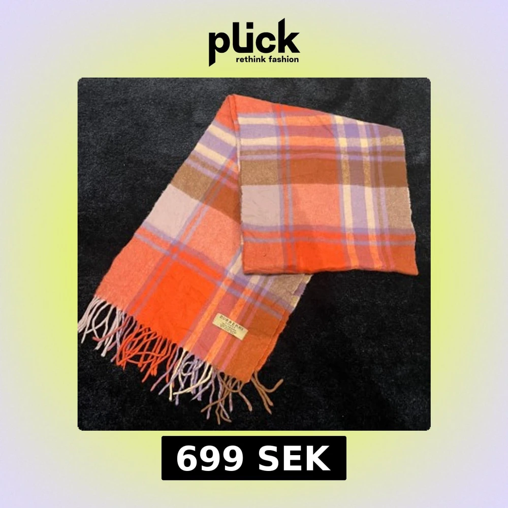 Säljer en snygg rutig halsduk från Burberry i orange, lila och beige toner. Den har fransar i ändarna och är perfekt för att hålla dig varm under kyliga dagar. Ett stilrent och klassiskt val för din garderob. 100% cashmere.