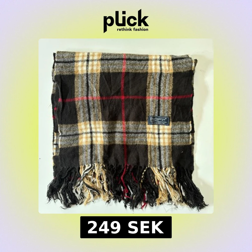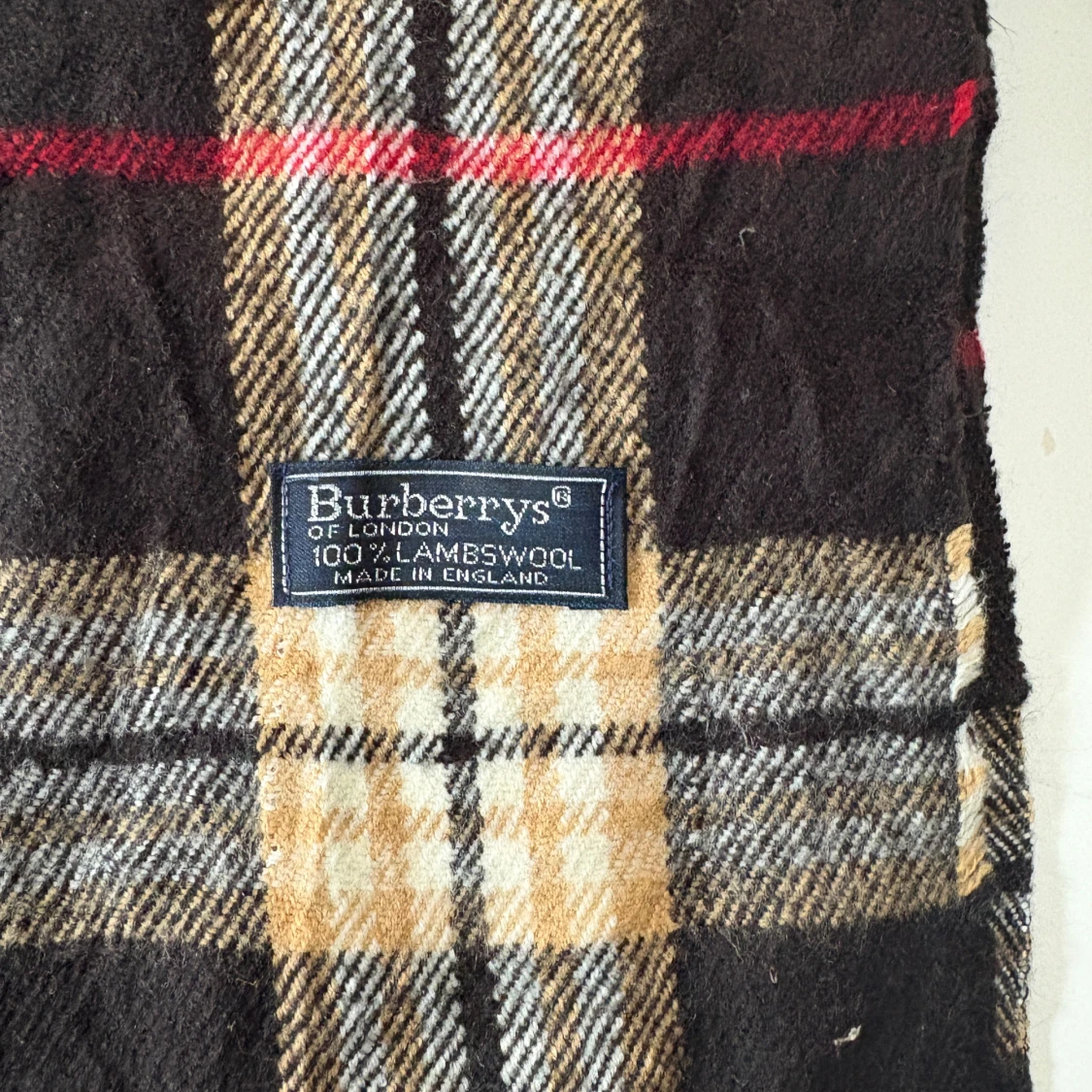 Snygg rutig halsduk från Burberry, tillverkad i 100% lammull. Färgerna är svart, beige, vit och röd med klassiskt rutmönster och fransar i ändarna.
