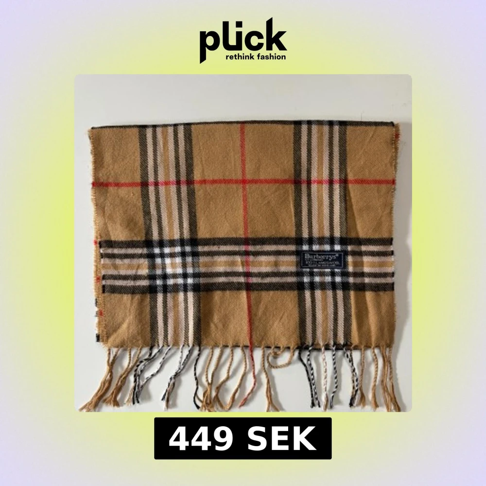Snygg klassisk halsduk från Burberrys i 100% lammull. Beige botten med rutigt mönster i svart, vitt och röda linjer. Mjukt material och fransar i ändarna.