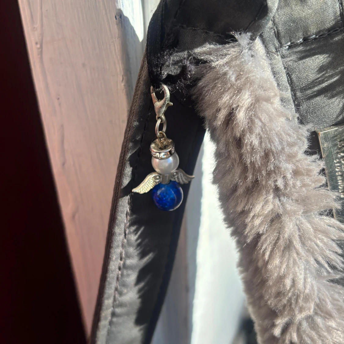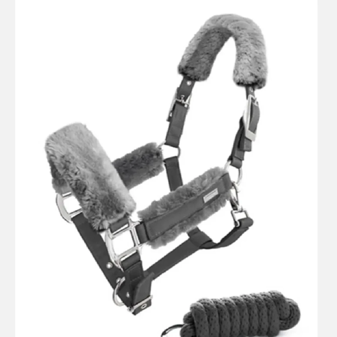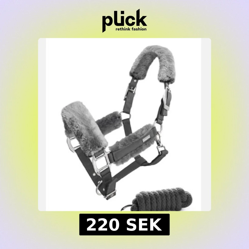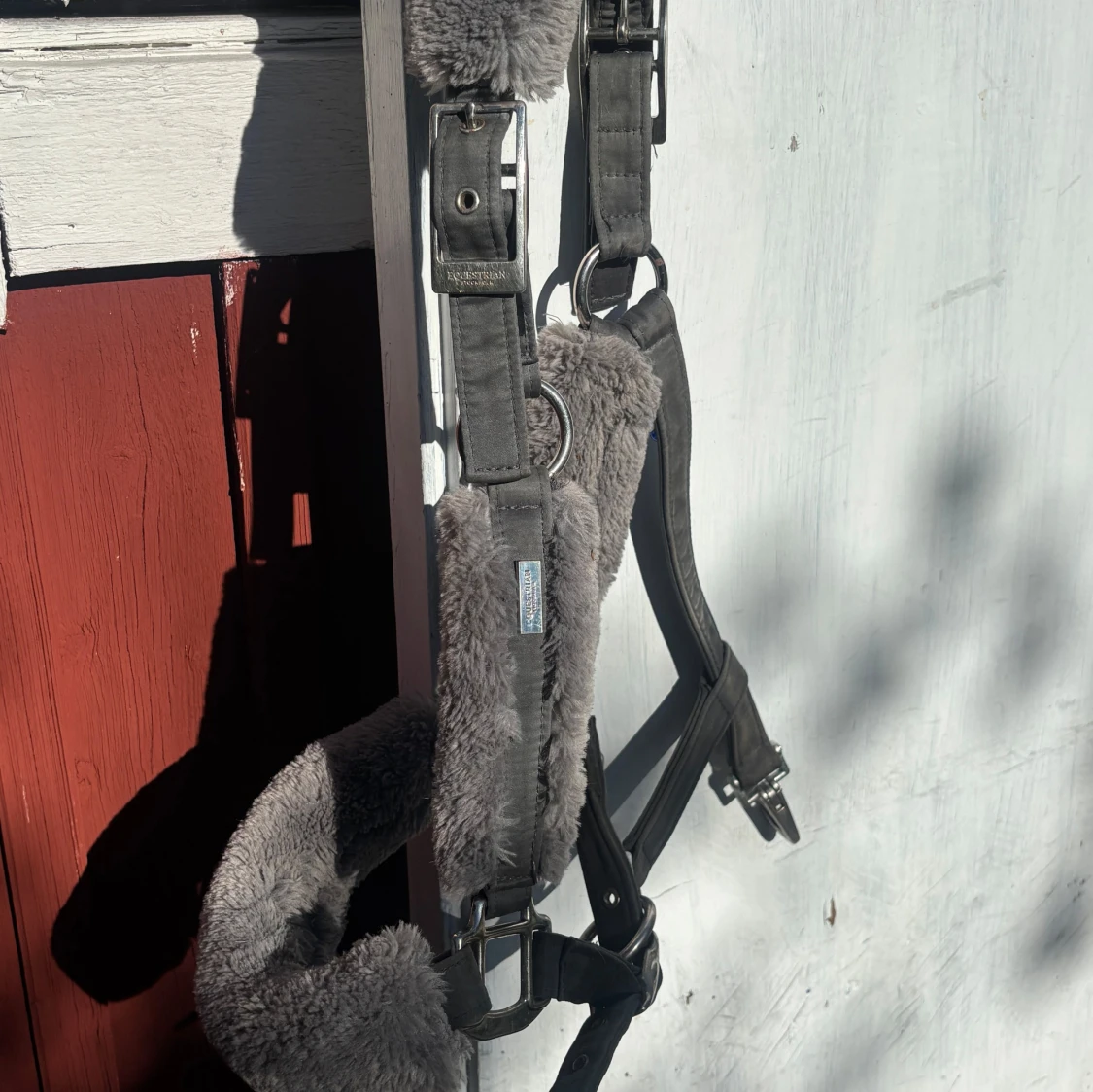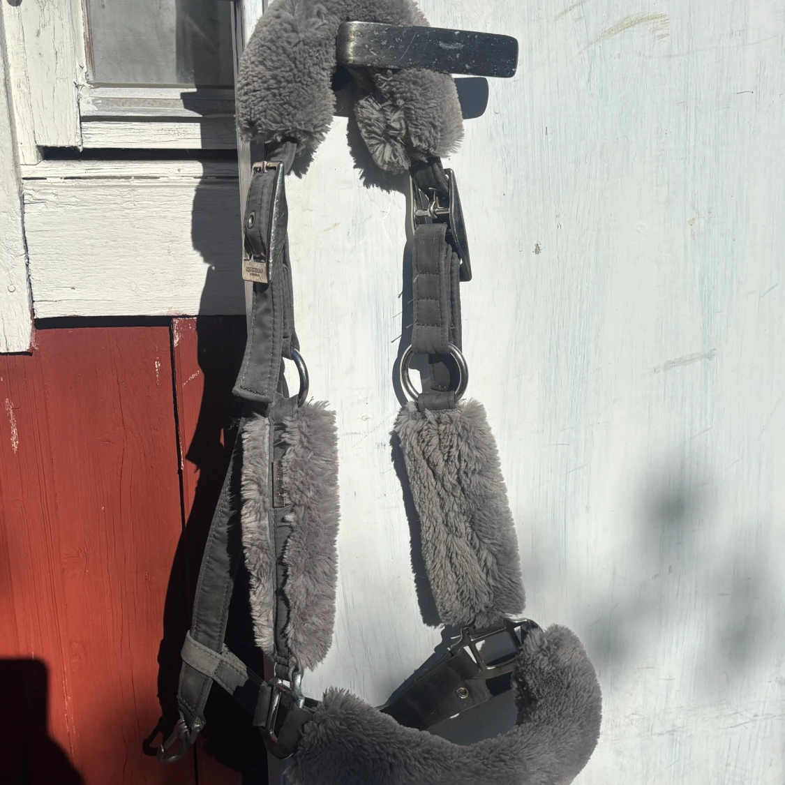 Säljer en grå grimma från Equestrian stockholm med mjuk, fluffig fuskpäls på nos, nacke och sidor. Grimman har silvriga spännen och en liten blå ängel-berlock. Perfekt för att ge hästen extra komfort och stil i stallet. Grimma, grimskaft och lyckoängel ingår, storlek COB