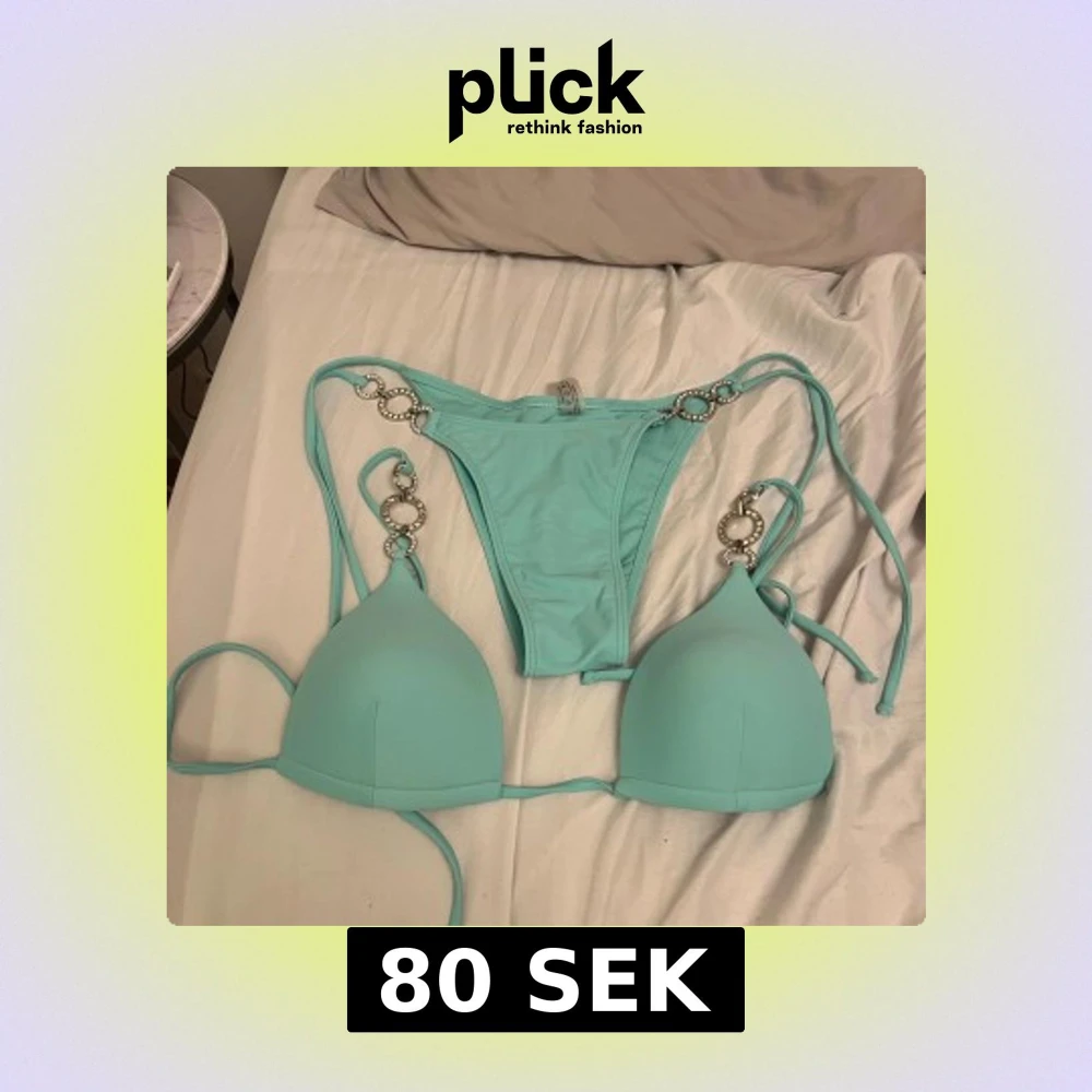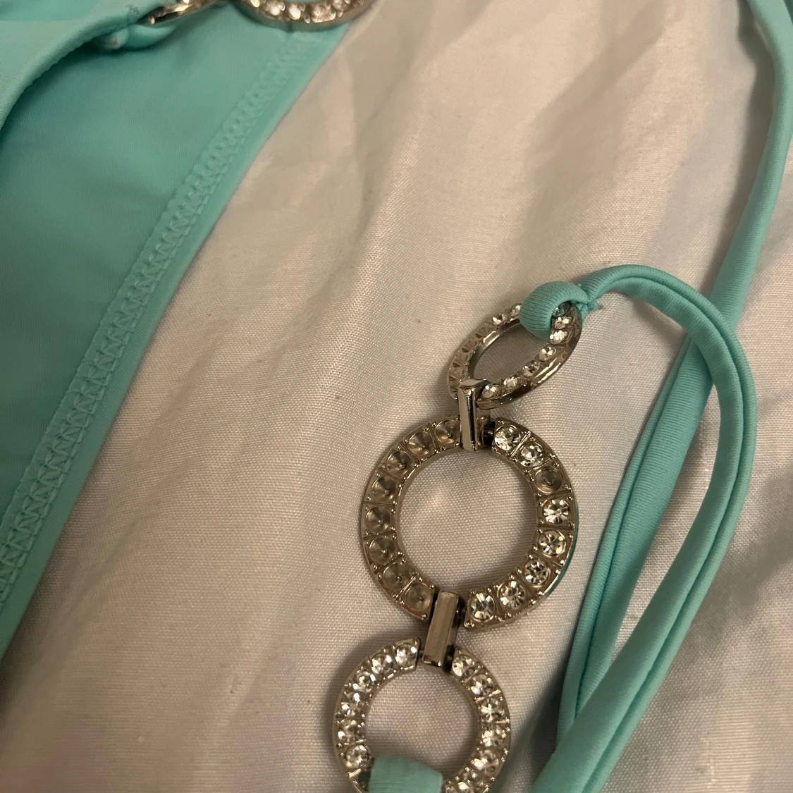 Supersnygg turkos bikini med triangeltopp och smala knytband. Både överdel och underdel har glittriga ringar i silver med stenar som ger en lyxig känsla. Perfekt för stranden eller poolen när du vill sticka ut lite extra. Gått av några stenar men inget man tänker på