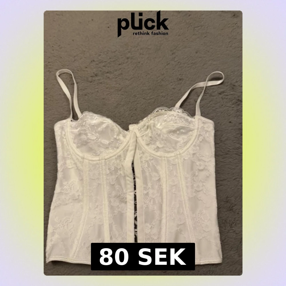 Säljer en vit väst med tunna axelband och vacker spetsdetalj. Västen har snörning i sidan och hakar framtill för stängning. Sitter tajt och har en feminin, elegant look med fina spetsmönster över hela plagget.
