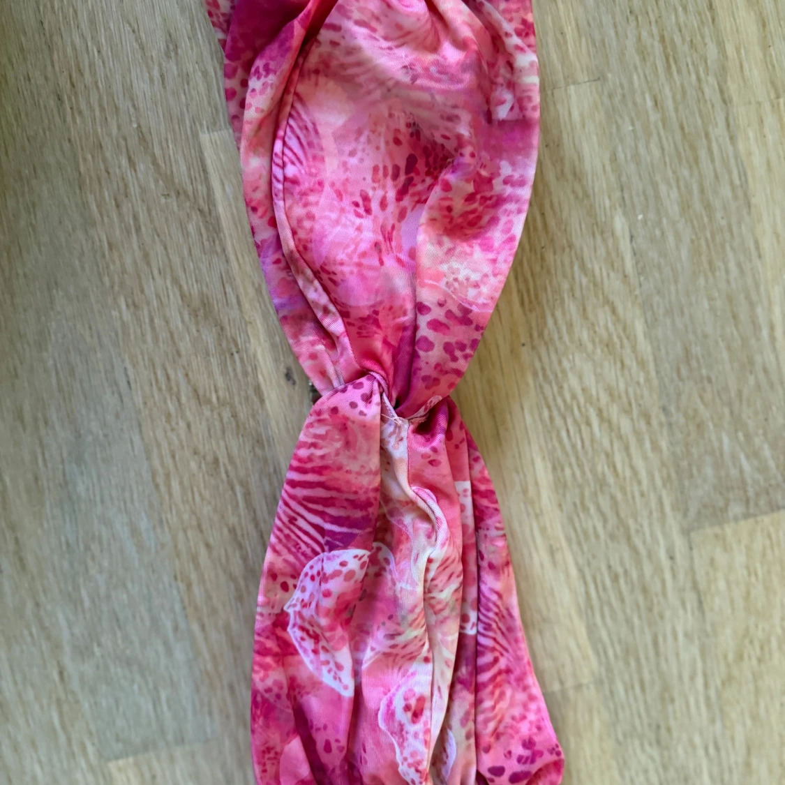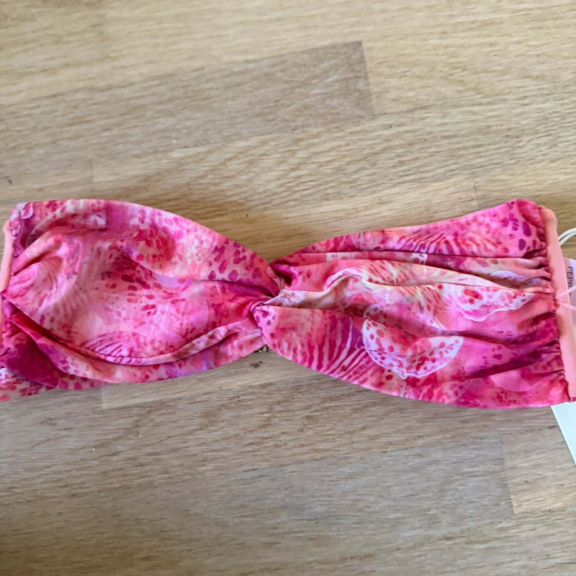 Säljer en snygg bandeau bikini i rosa och ljusrosa toner med twistad detalj framtill. Bikinin har ett abstrakt mönster och axelbandslös överdel. Materialet är mjukt och stretchigt, perfekt för strandhäng och soliga dagar.