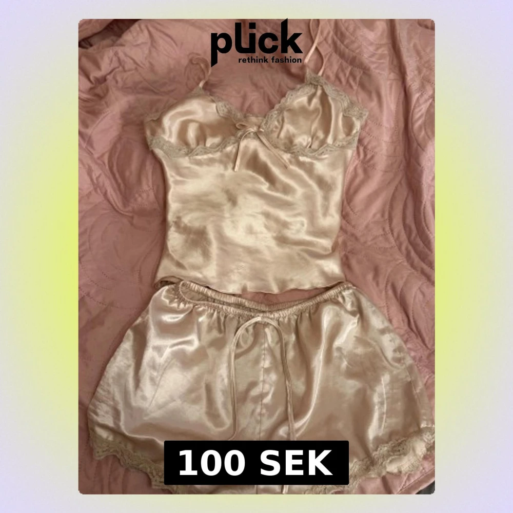 Säljer ett glansigt pyjamas set i siden med tunna axelband och spetsdetaljer vid halsringningen. Båda tillsammans 100kr, enskilt 50kr💗