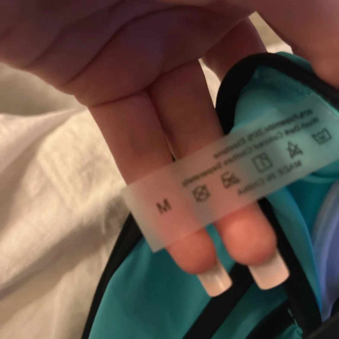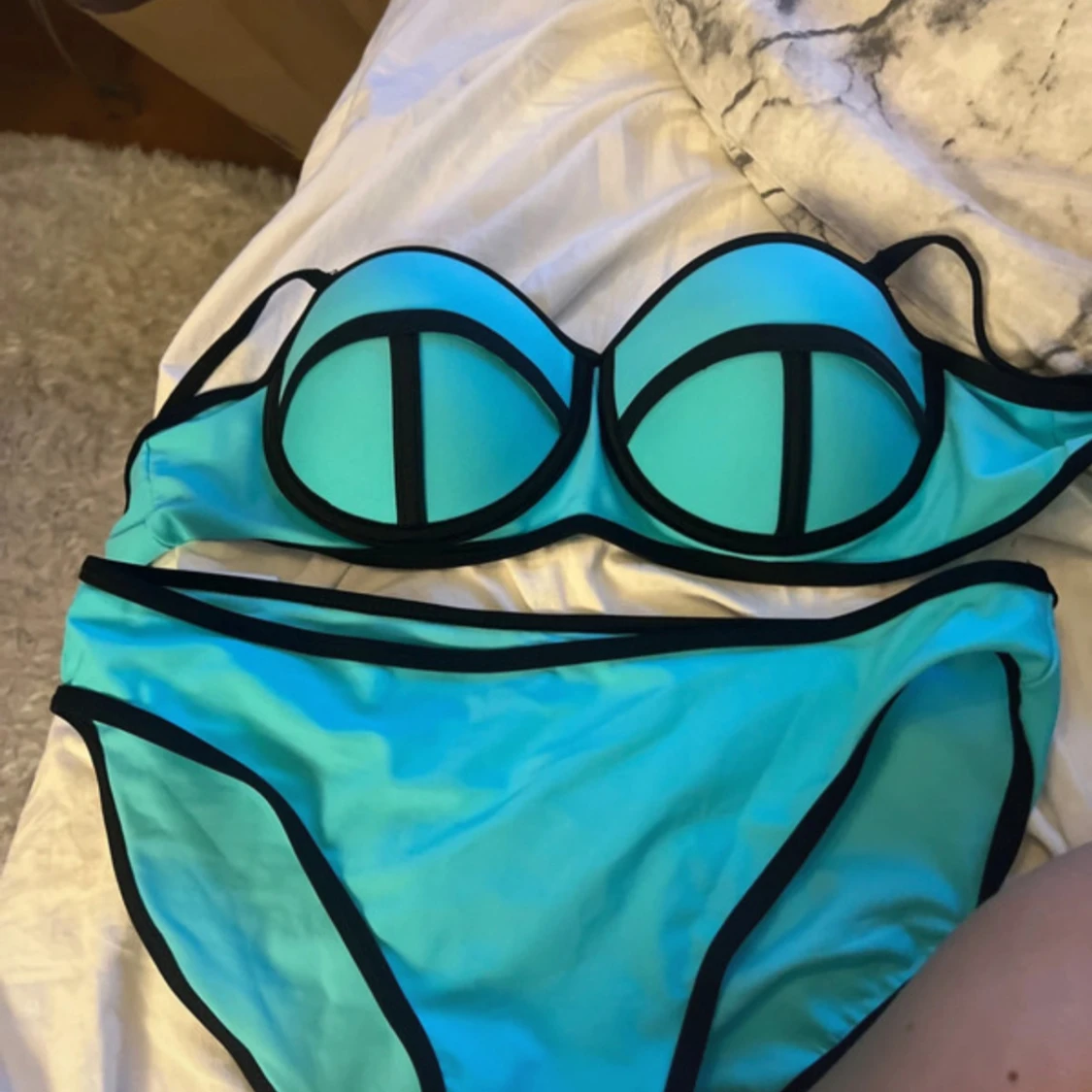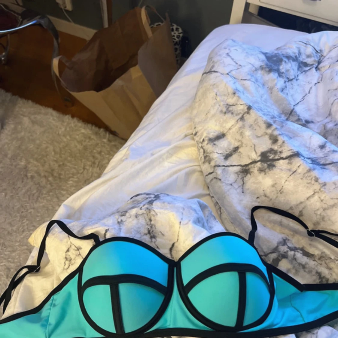 Turkos triangle liknande bikini från Verani clothing. Bikinin är storlek m men överdelen var alldeles för stor för mig som vanligtvis har a-kupa så jag skulle gissa att överdelen är c-kupa men underdelen sitter bra som m❤️