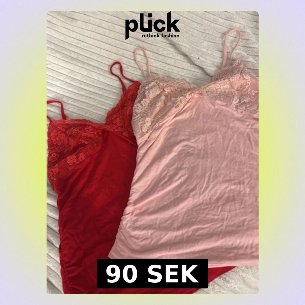 Säljer två nattlinnen med tunna axelband, ett i rött och ett i ljusrosa. Båda har spetsdetaljer upptill och är gjorda i ett mjukt, stretchigt material.
