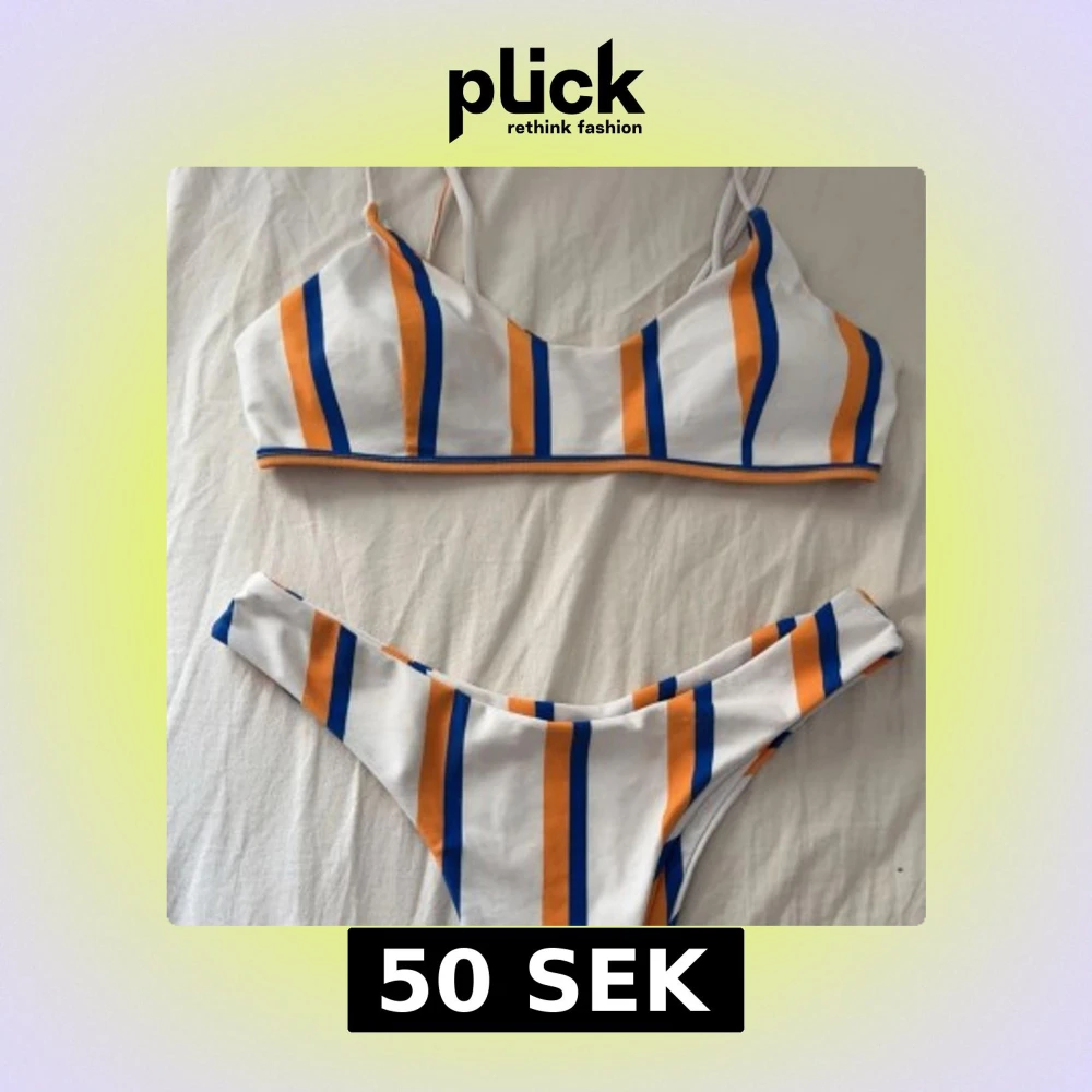 Snygg bikini med sportig vibe i vitt med vertikala orangea och blå ränder. Toppen har smala axelband och byxan är högt skuren. Perfekt för stranden eller poolen, och ger en fräsch och färgglad look. Materialet är mjukt och stretchigt syntet. Den har blivit lite missfärgad som syns på bild2, men inget som syns jättemycket