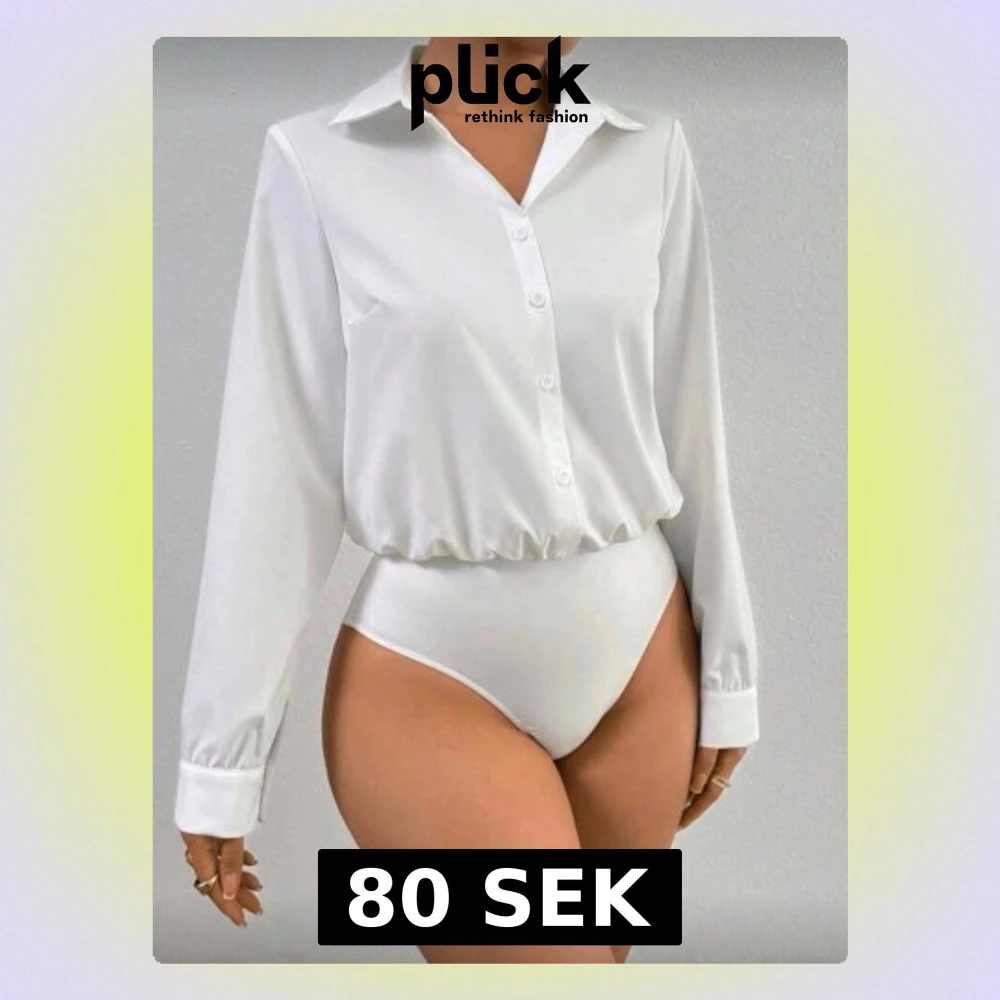 Stilren vit body i skjortmodell med långa ärmar, krage och knäppning framtill. Tillverkad i ett mjukt och stretchigt material som ger en snygg passform. Perfekt för en trendig och clean look.