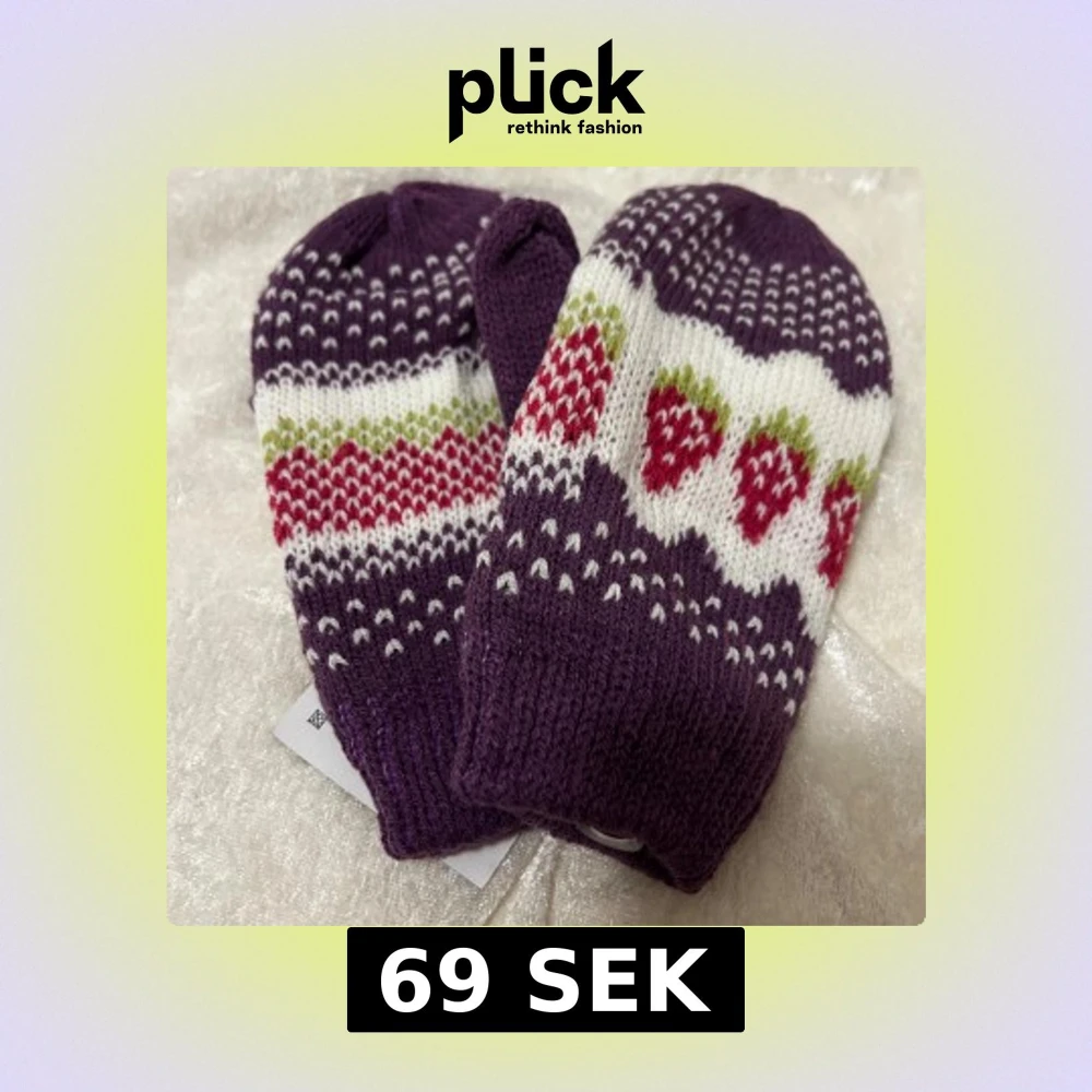 Säljer två par stickade vantar. Ena paret är lila med vita, röda och gröna detaljer och har ett bärmönster. Andra paret är ljusblått med prickar i rött, rosa och vitt. Båda paren är tumvantar och perfekta för kalla dagar. Stlk S-M 69kr/par